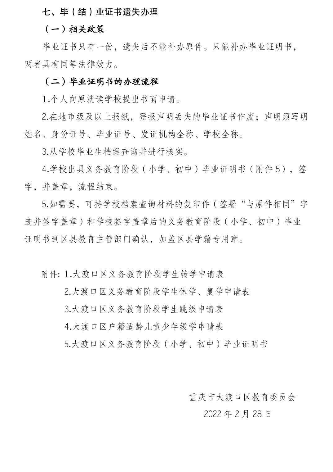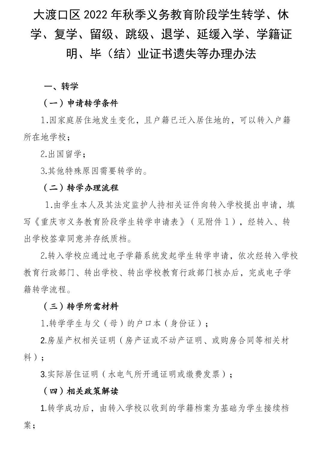 大渡口区2022年秋季义务教育阶段学生转学、休学、复学、留级、跳级、退学、延缓入学、学籍证明、毕(结)业证书遗失等办理办法.pdf