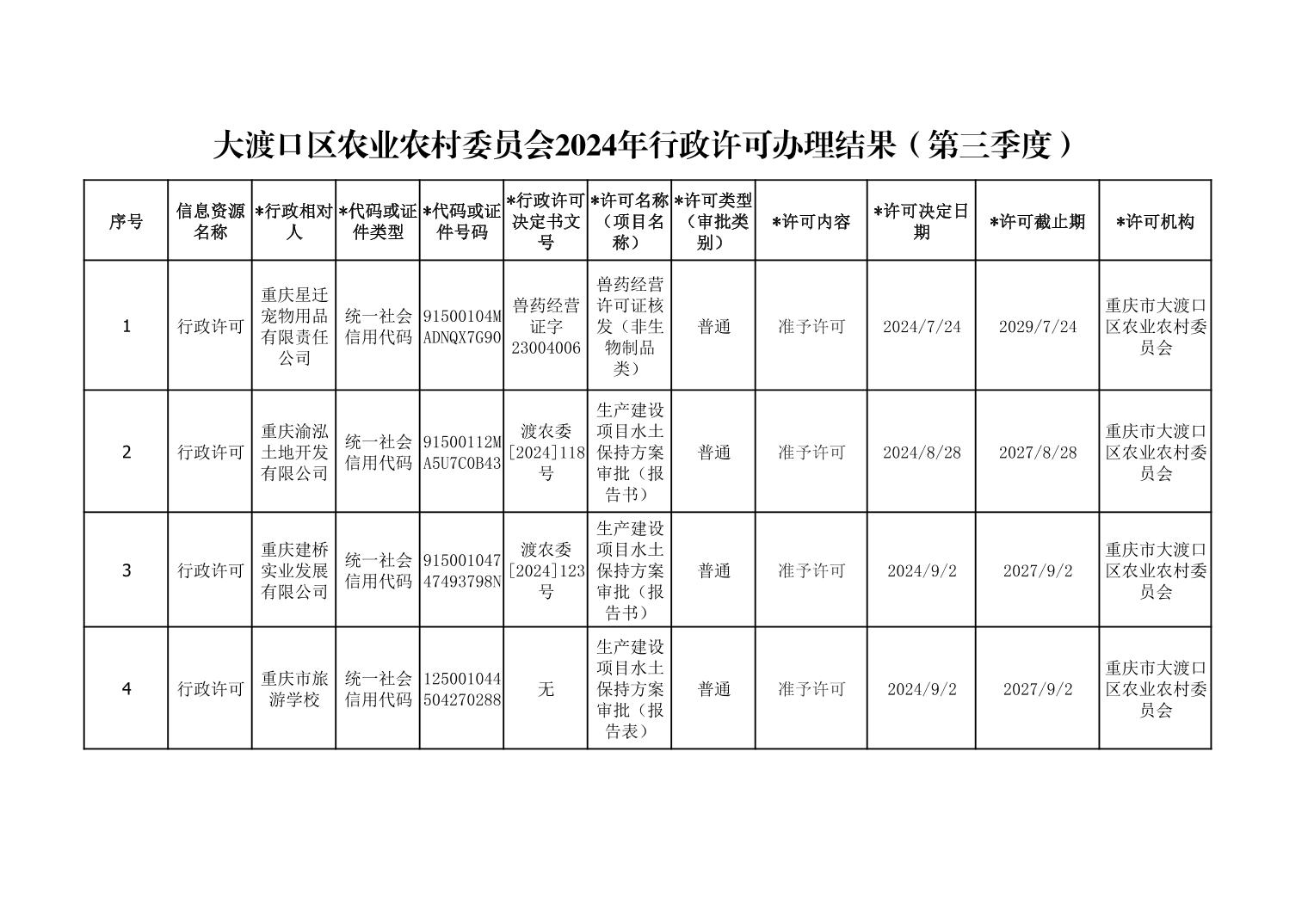 大渡口区农业农村委员会2024年行政许可办理结果(第三季度)
