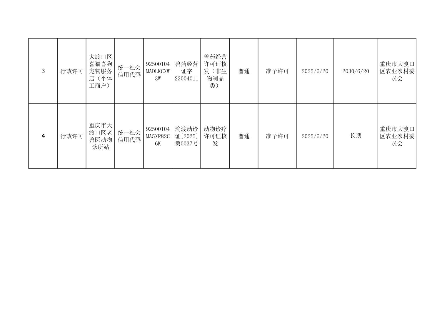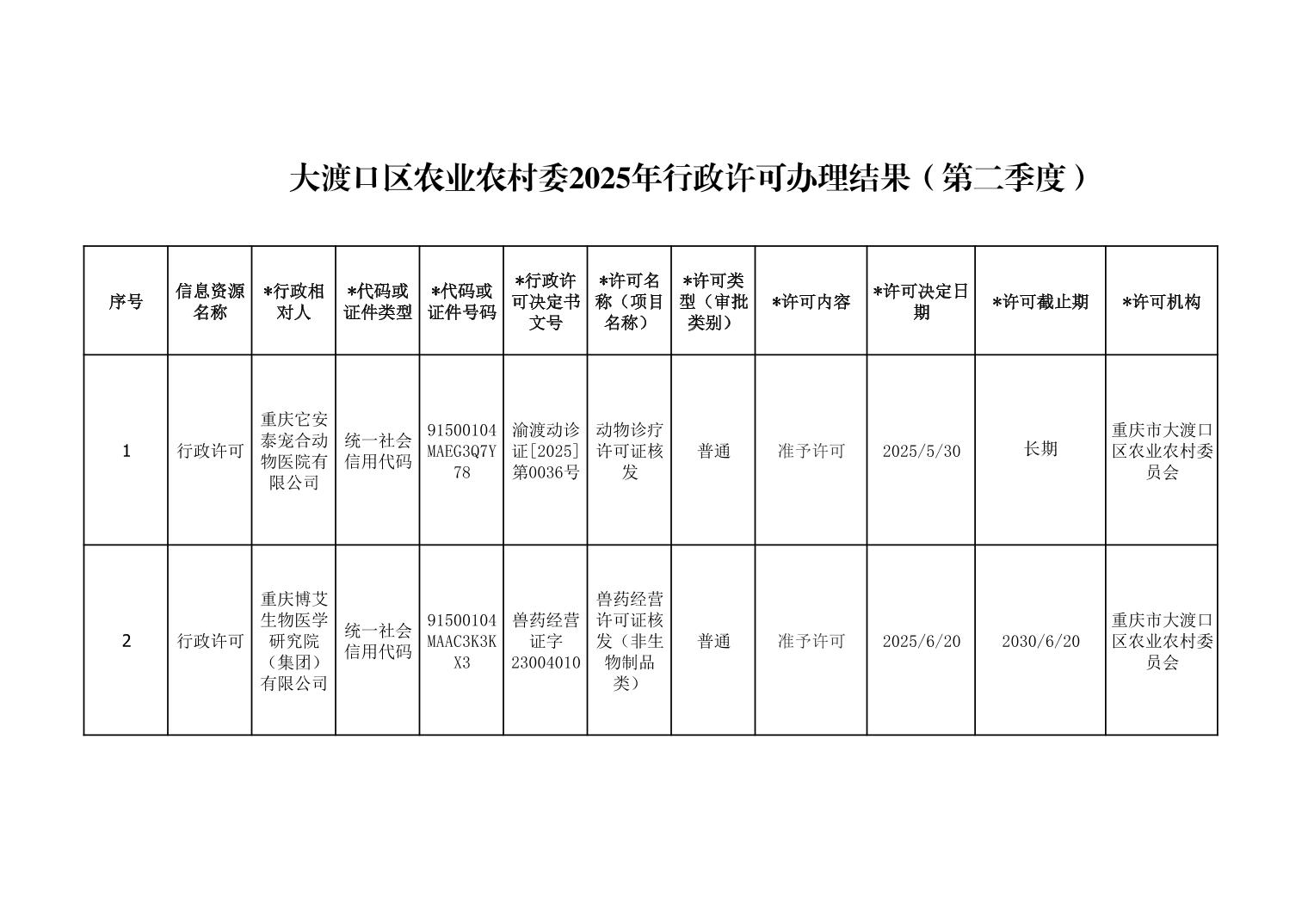 大渡口区农业农村委2025年行政许可办理结果(第二季度)
