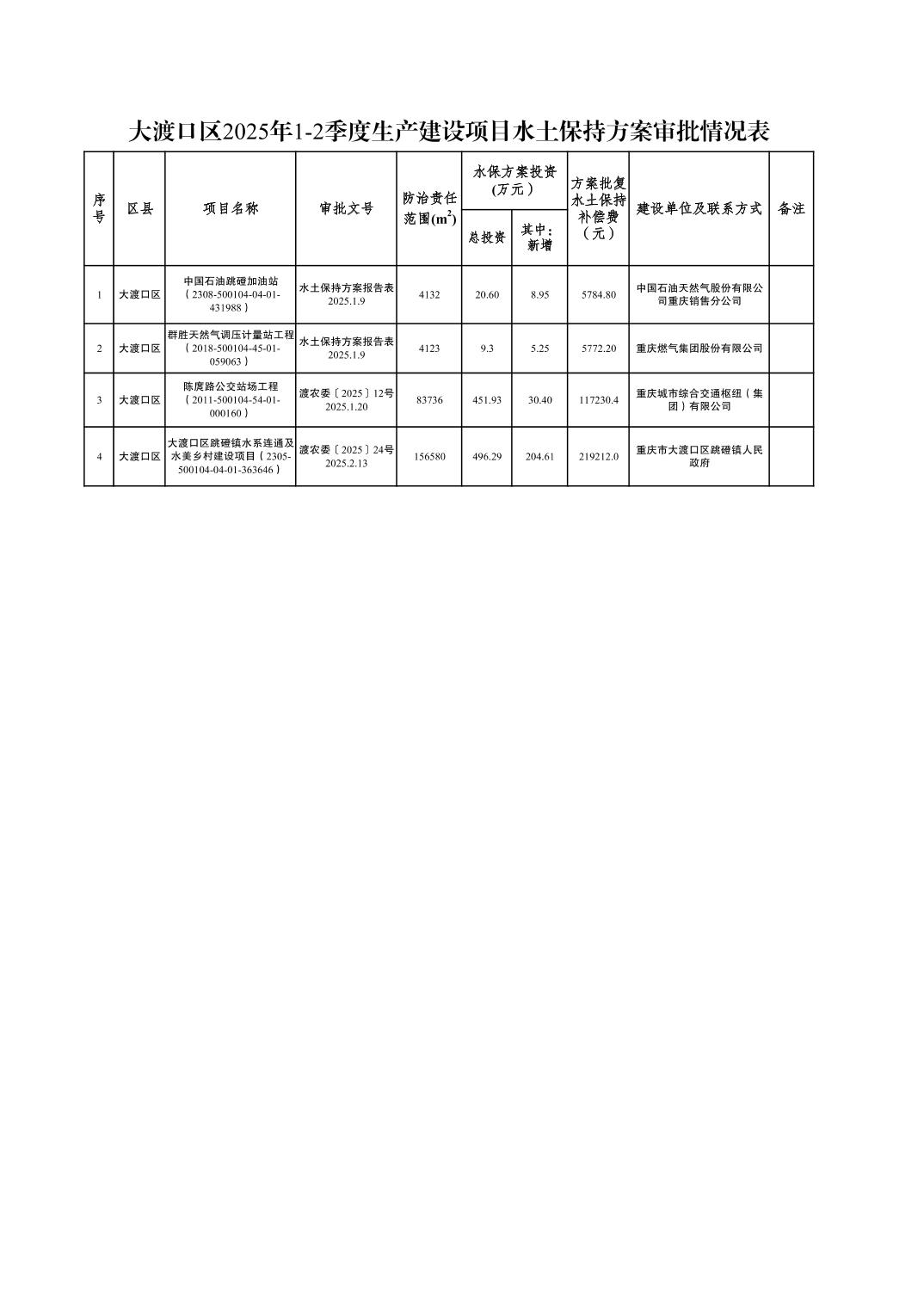 大渡口区2025年1-2季度生产建设项目水土保持方案审批情况表