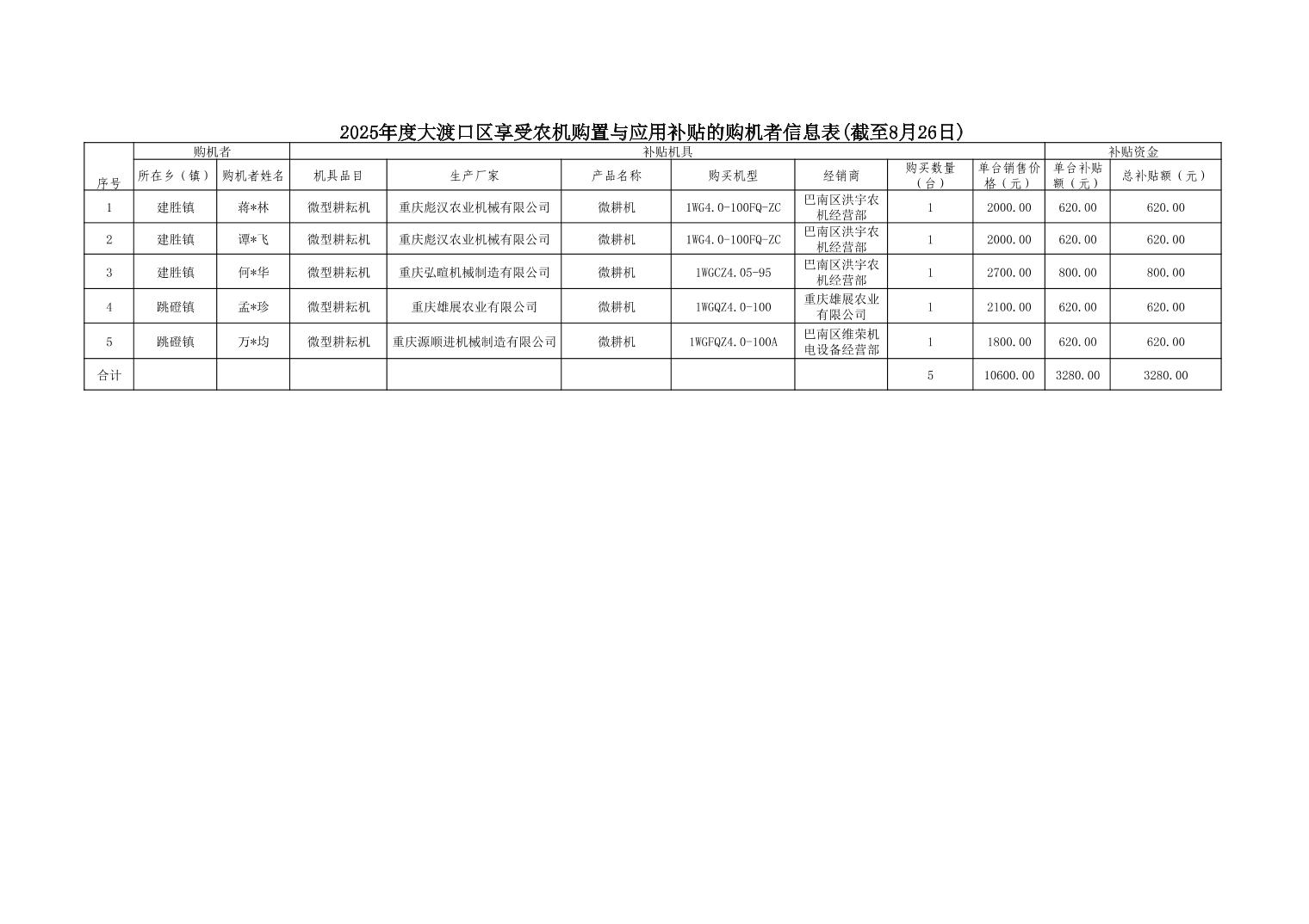 2025年度大渡口区享受农机购置与应用补贴的购机者信息表(截至8月26日)