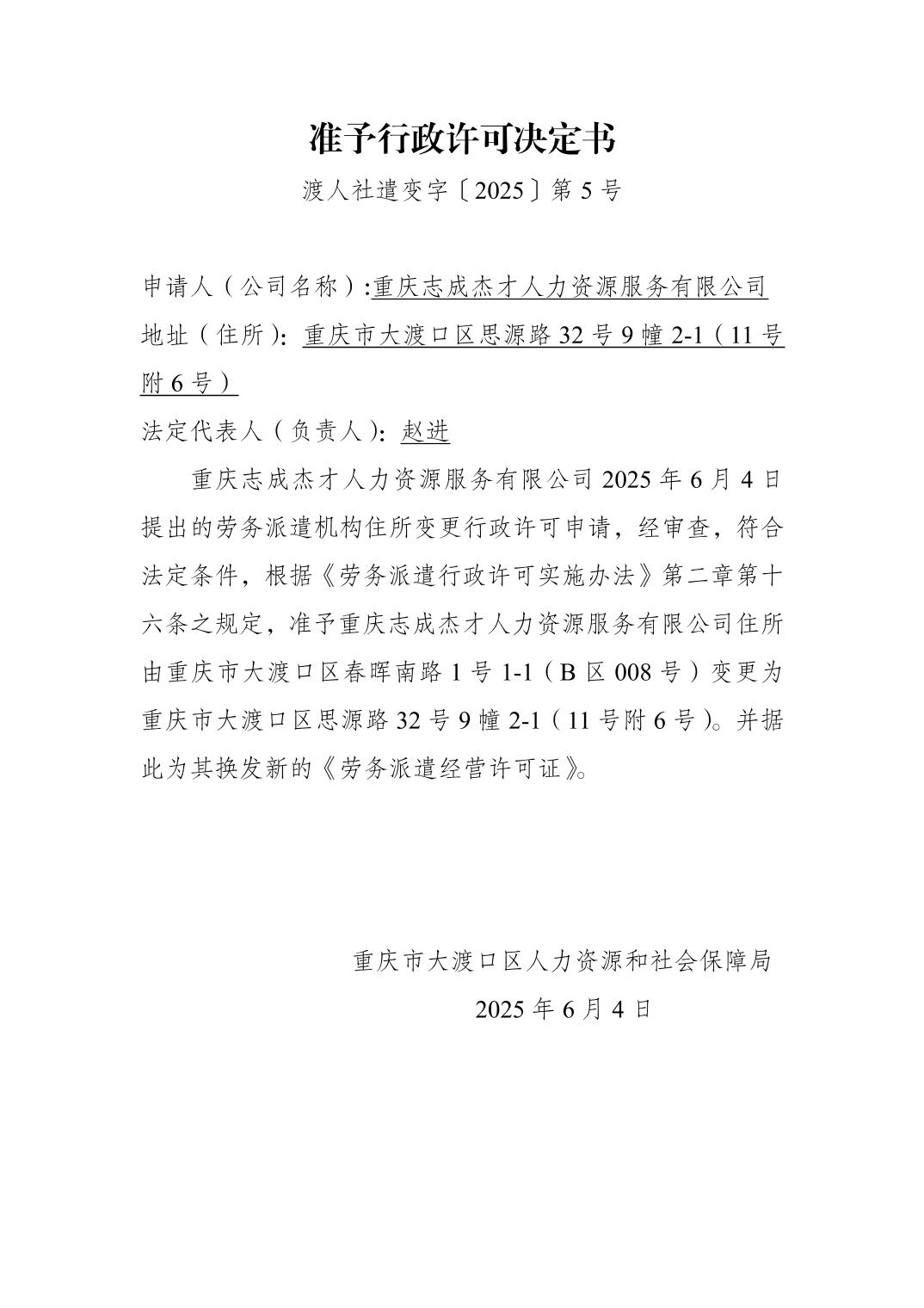 准予行政许可决定书(重庆志成杰才人力资源服务有限公司)
