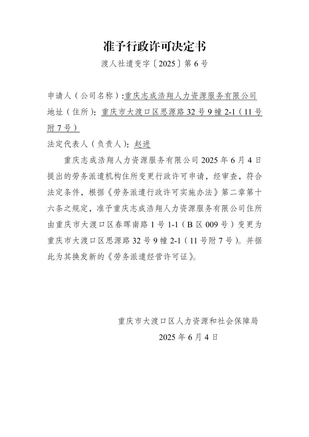 准予行政许可决定书(重庆志成浩翔人力资源服务有限公司)