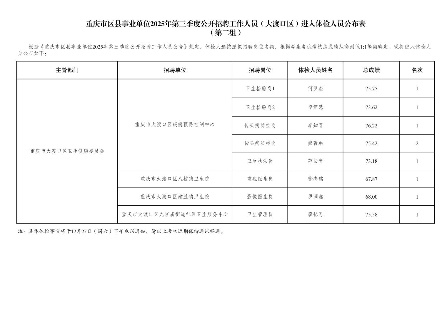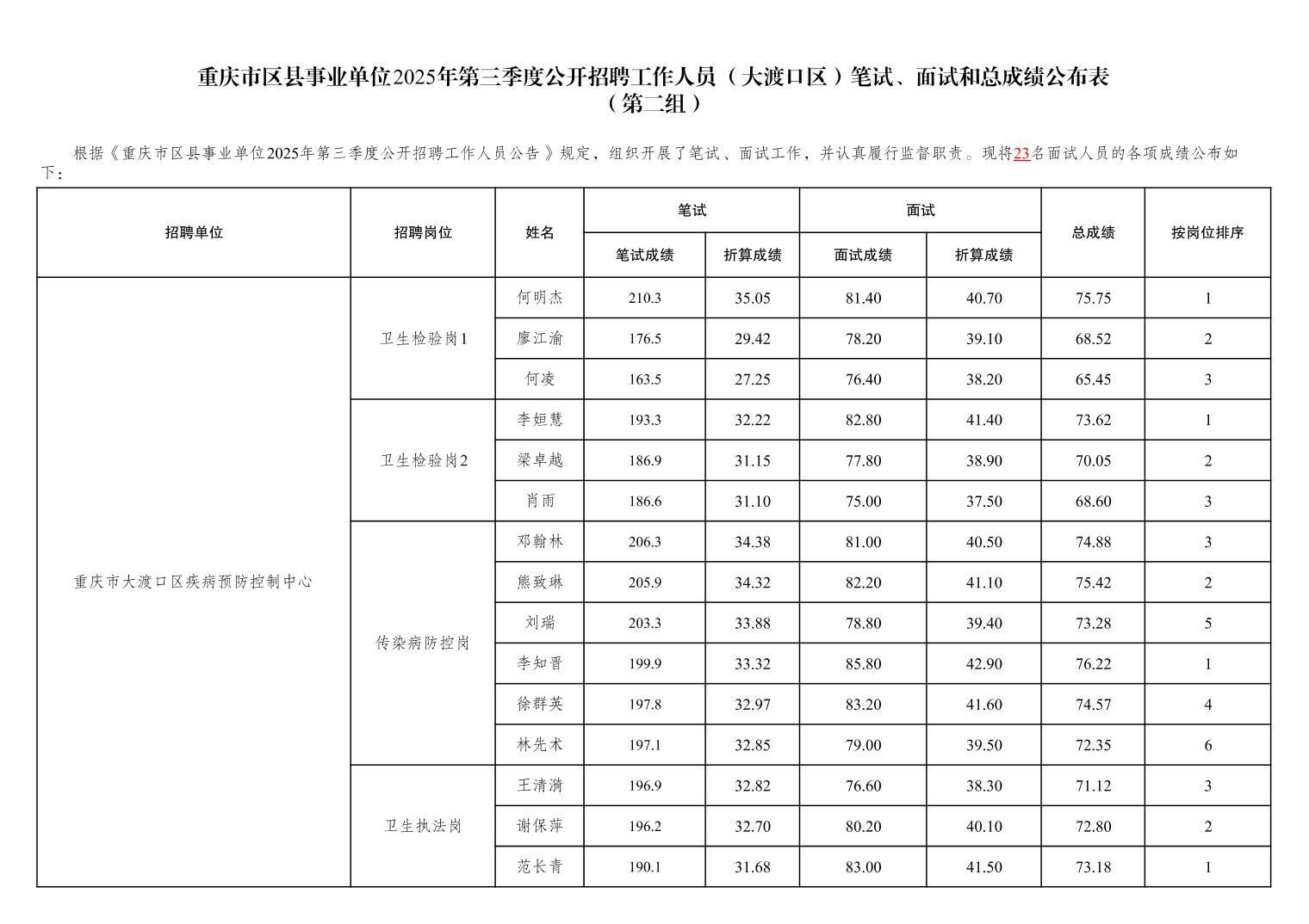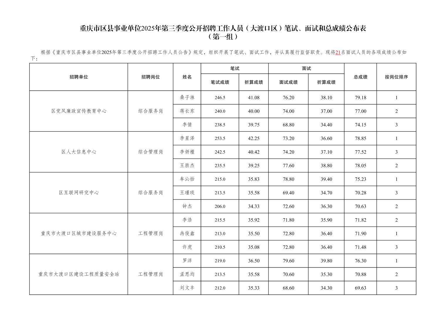重庆市区县事业单位2025年第三季度公开招聘工作人员(大渡口区)笔试、面试和总成绩公布表
