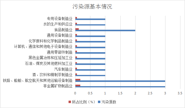 根据重庆市大渡口区2022年环境统计提供的资料,本年度参加统计的工业企业共计18家,其中有废气污染源排放的工业企业14家,有废水污染源排放的工业企业11家。这18家工业污染源分布在13个行业中,其中分布在铁路、船舶、航空航天(3家)和非金属矿物制品业(3家)最多,共6家,占总量的33.33%,其次是水的生产和供应业、酒、饮料和精制茶制造业、汽车制造业、石油、煤炭及其他燃料加工业、黑色金属冶炼和压延加工业、通用零部件制造、计算机、通信和其他电子设备制造业、化学原料和化学制品制造业、通用设备制造业、食品制造业、专用设备制造业各占总量的5.55%、5.55%、5.55%、5.55%、5.55%、5.55%、5.55%、5.55%、5.55%、11.11%、5.55%。详见表1-1。
