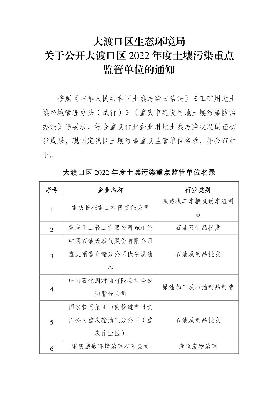 大渡口区生态环境局关于公开大渡口区2022年度土壤污染重点监管单位的通知