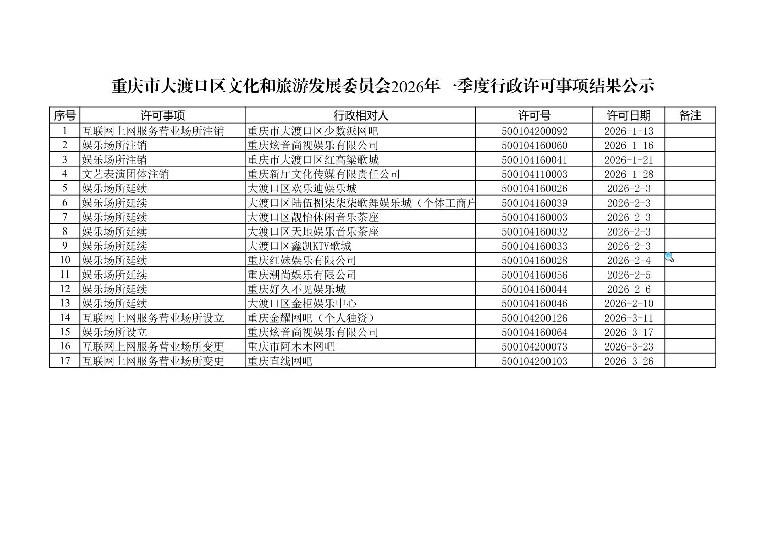 重庆市大渡口区文化和旅游发展委员会2026年一季度行政许可事项结果公示