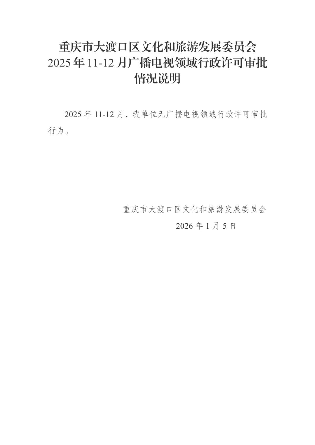 重庆市大渡口区文化和旅游发展委员会2025年11-12月广播电视领域行政许可审批情况说明