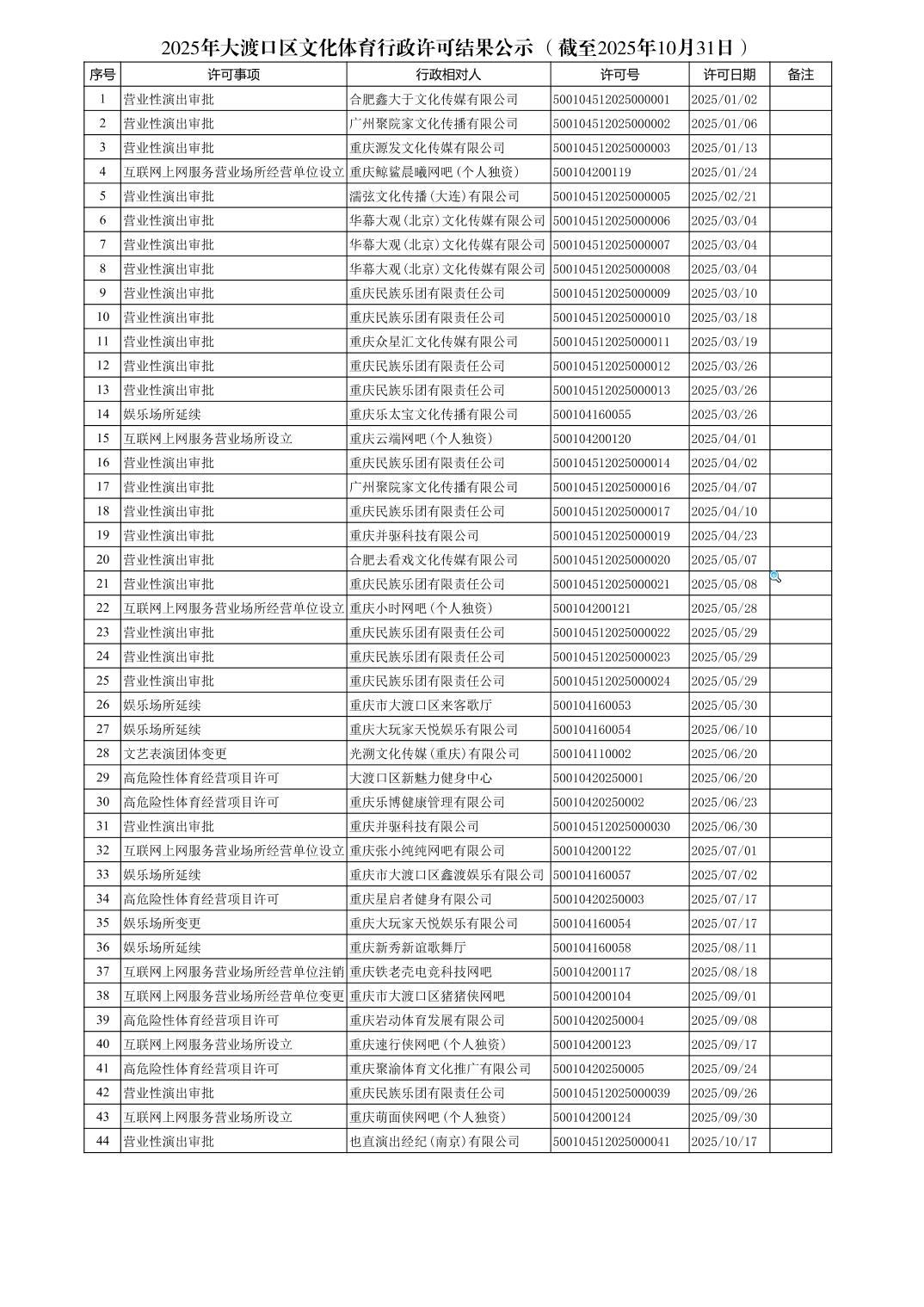 2025年大渡口区文化体育行政许可结果公示(截至2025年10月31日)