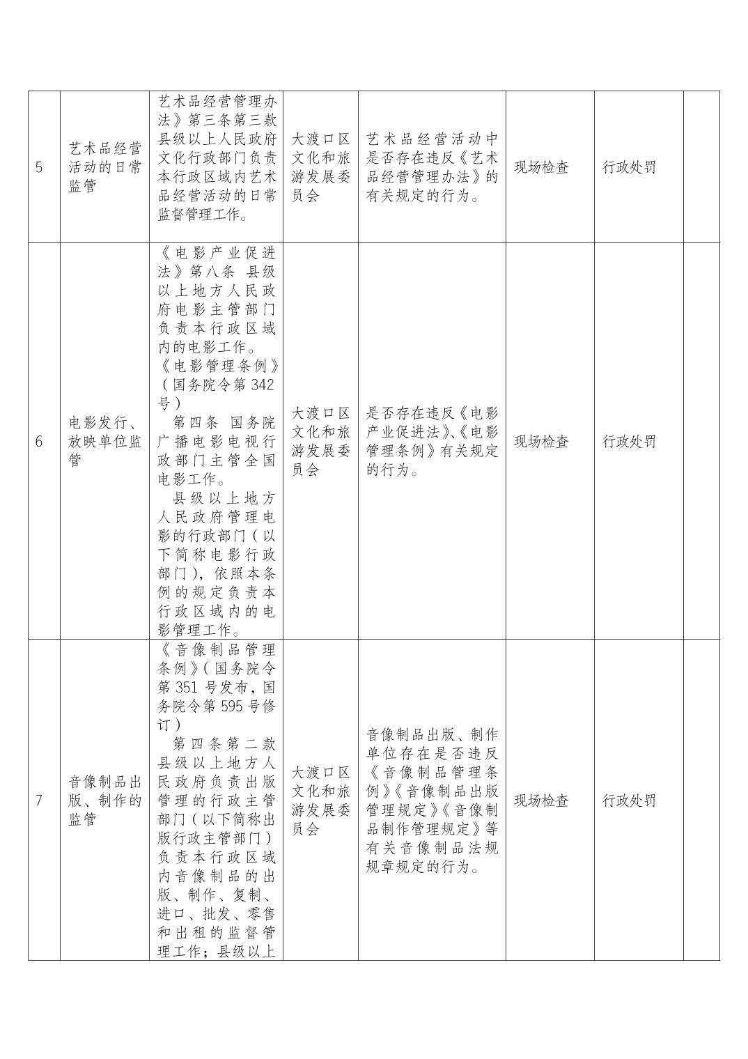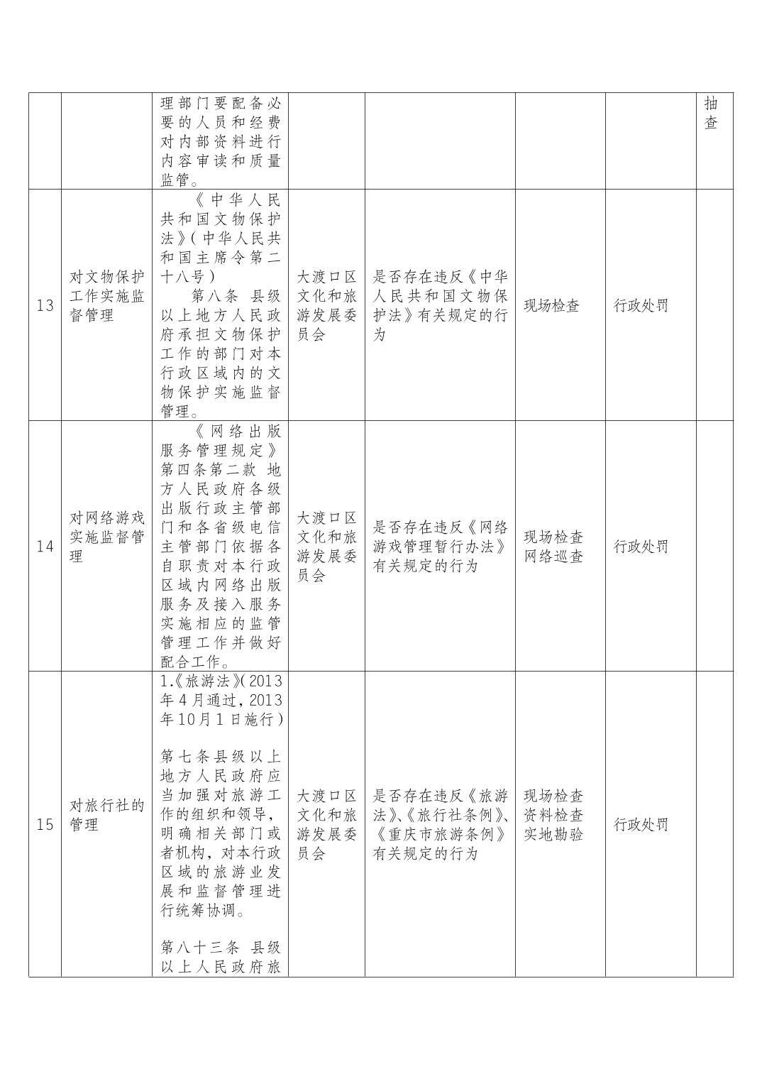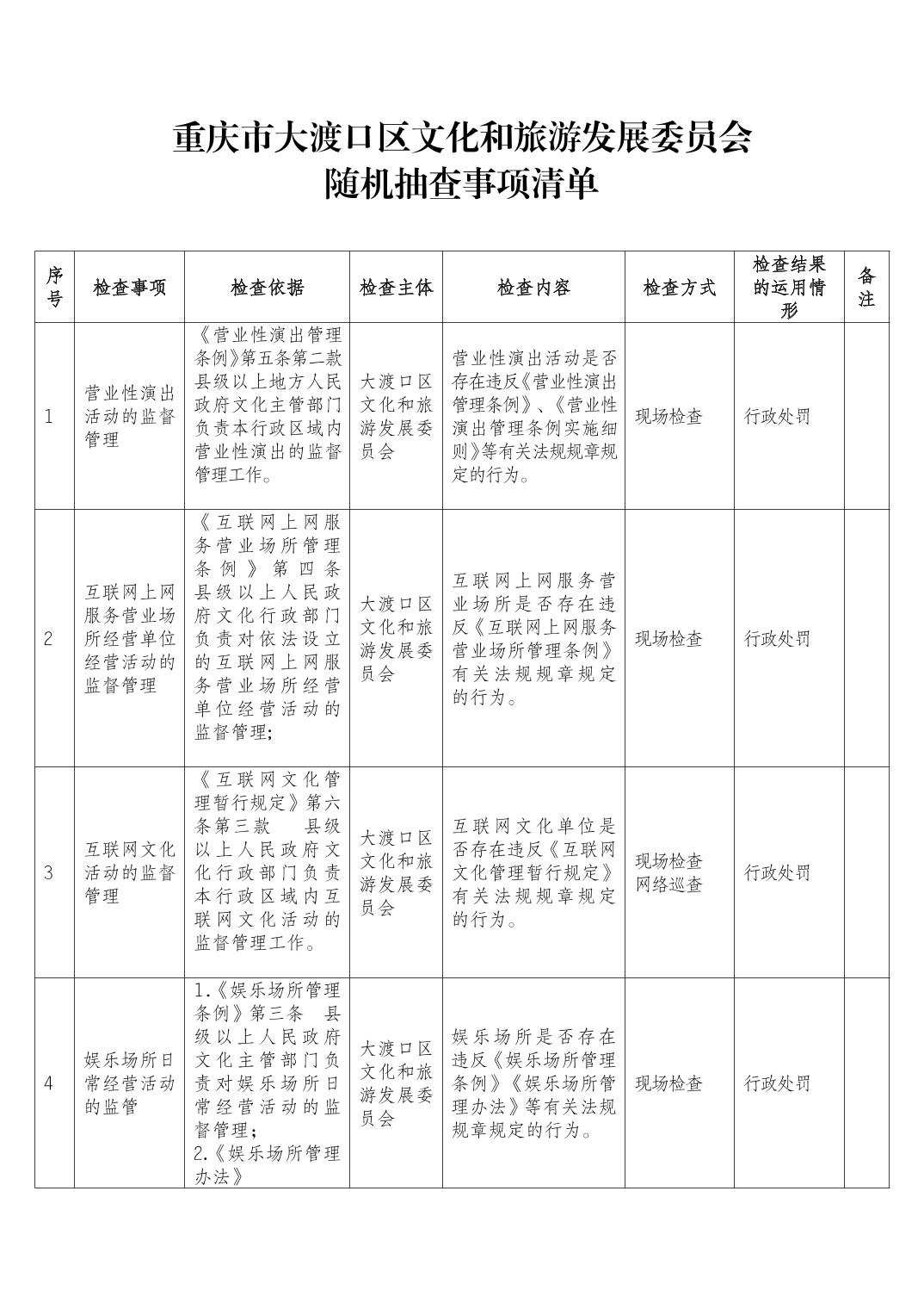 重庆市大渡口区文化和旅游发展委员会 随机抽查事项清单