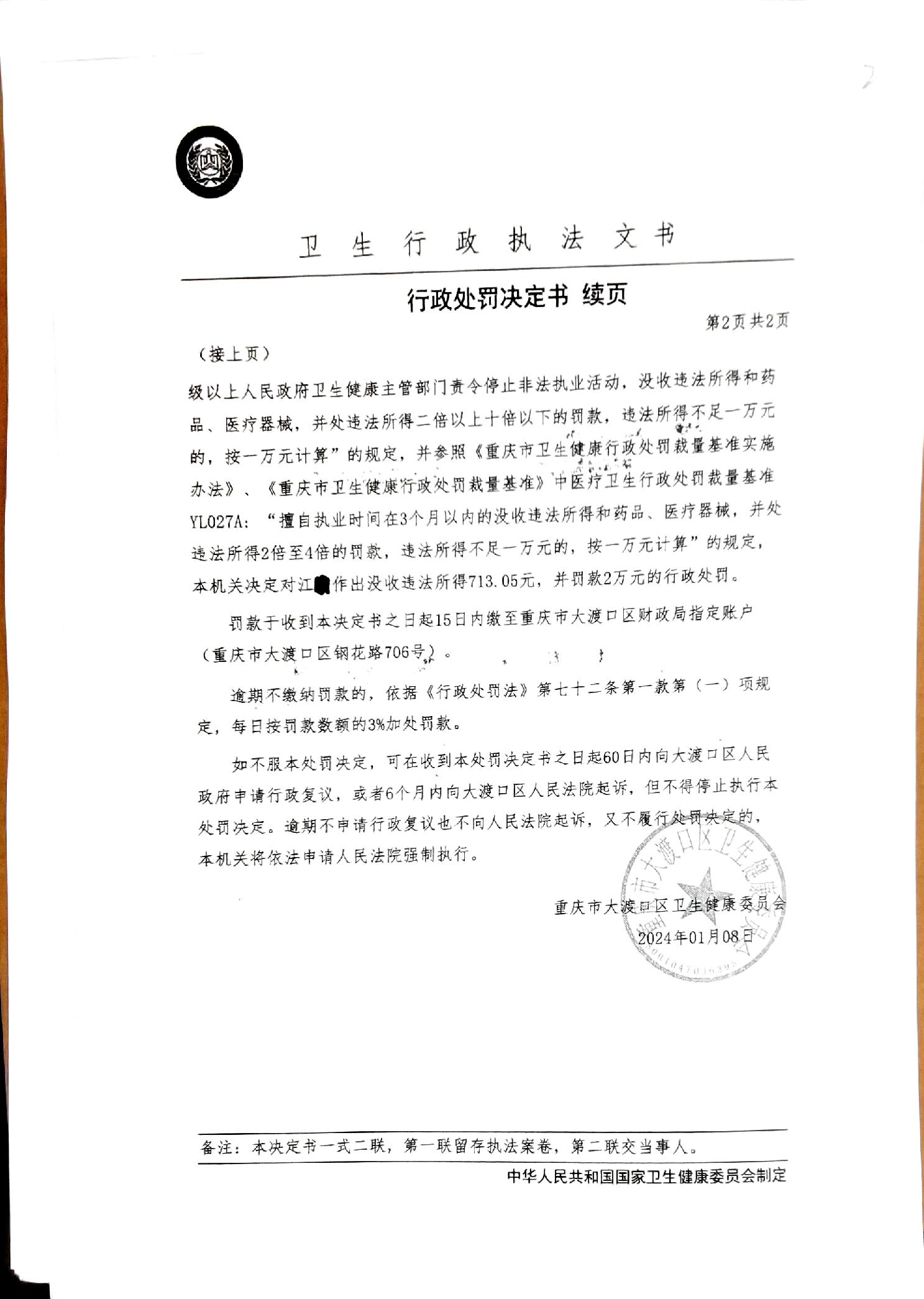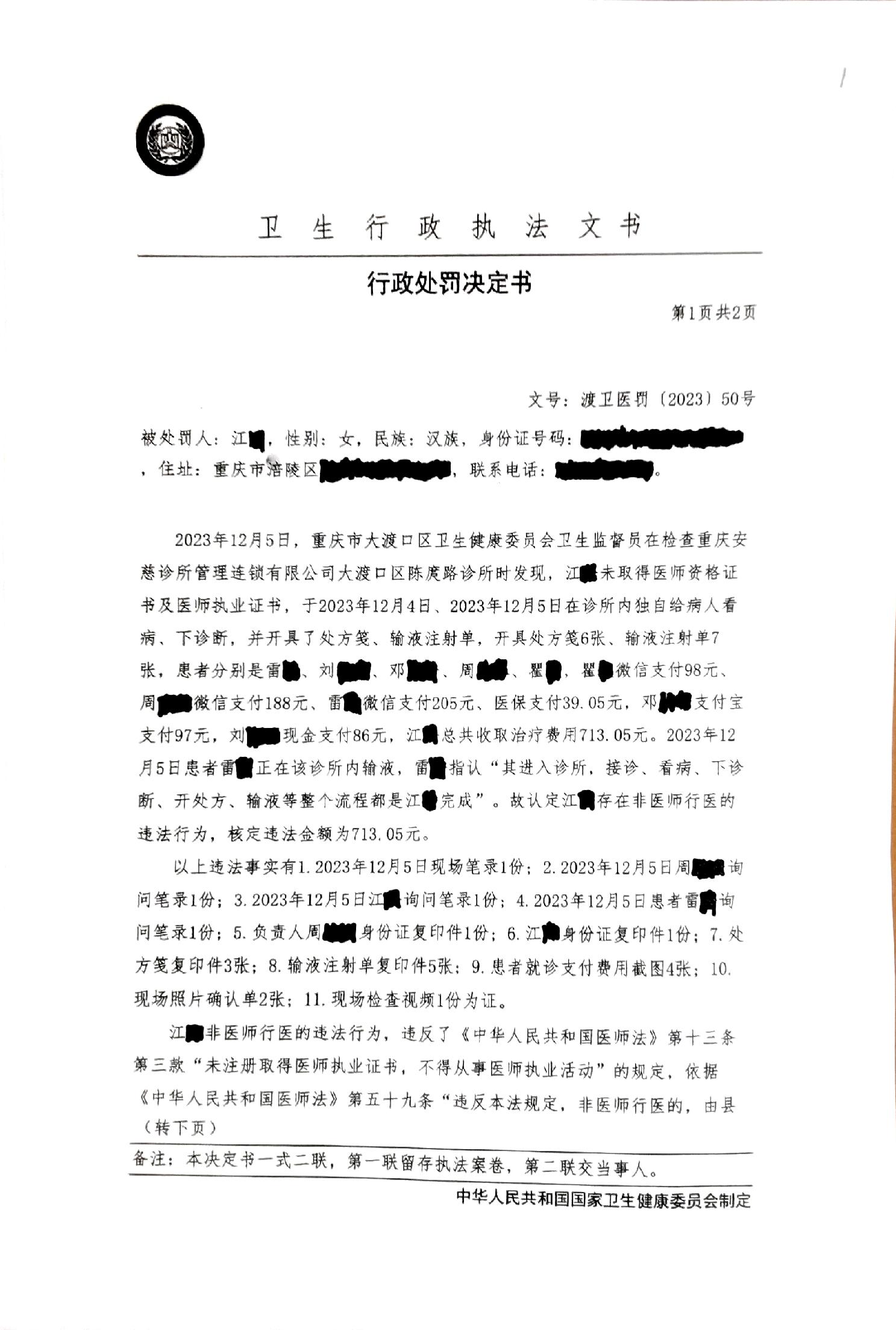 重庆市大渡口区卫生健康委员会行政处罚决定书(渡卫医罚[2023]50号)