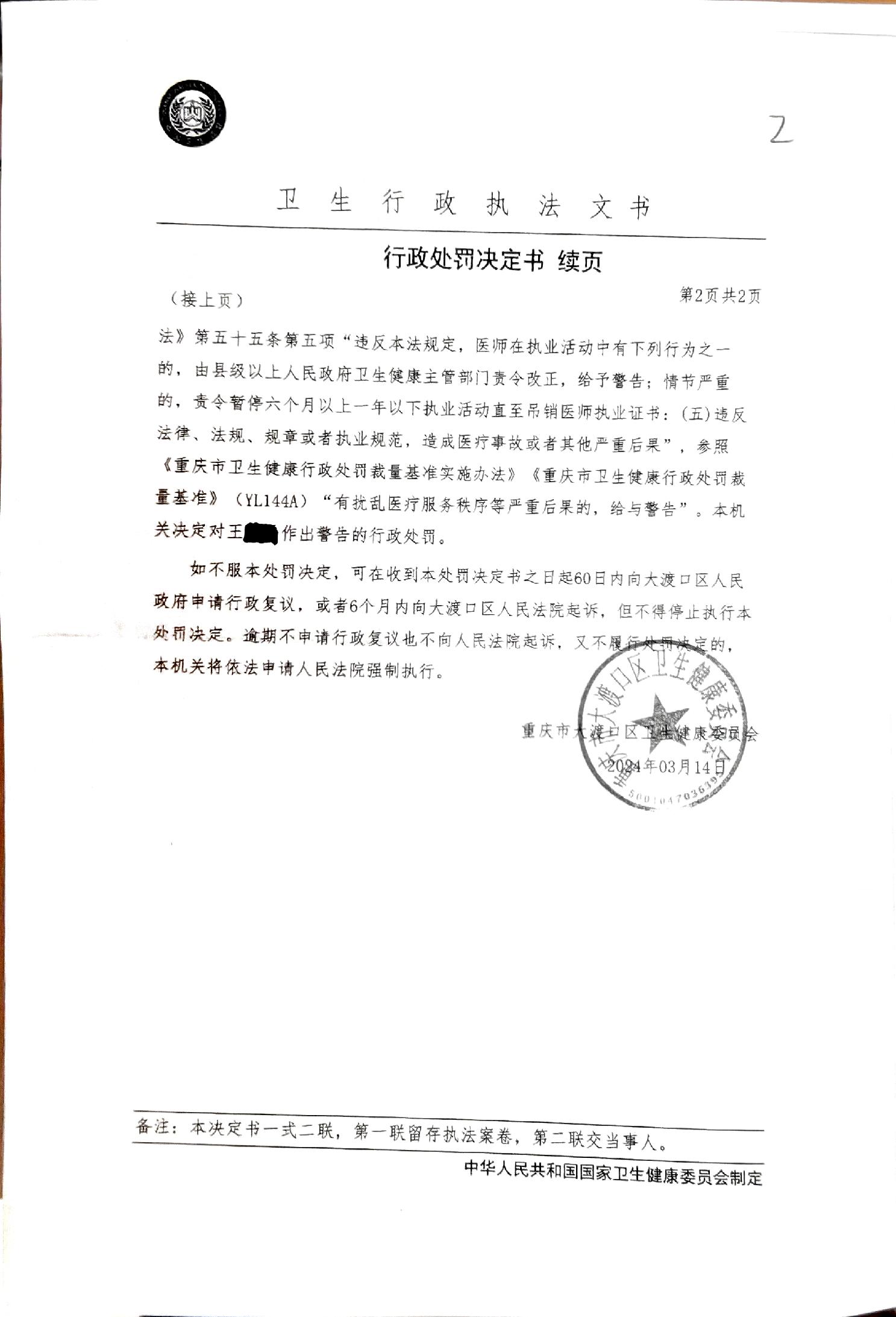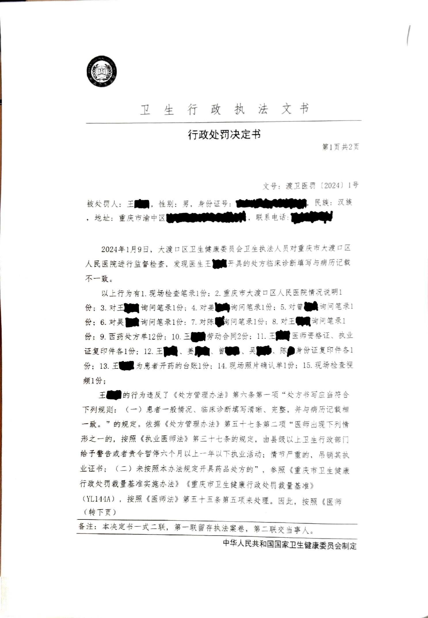 重庆市大渡口区卫生健康委员会行政处罚决定书(渡卫医罚[2024]1号).pdf