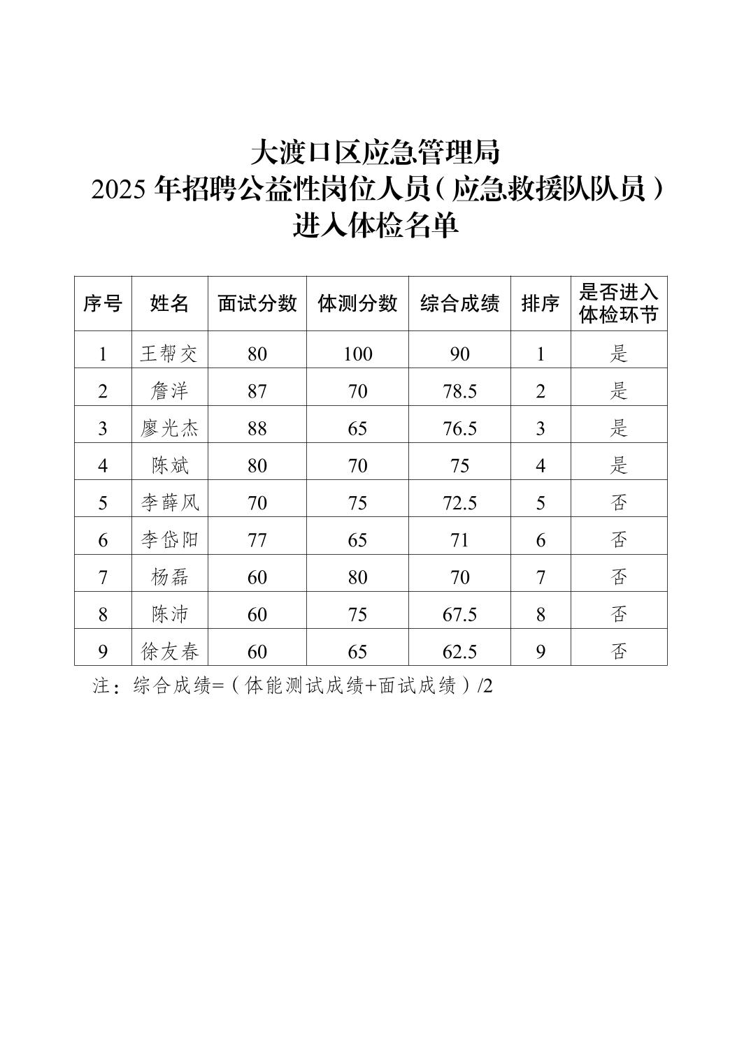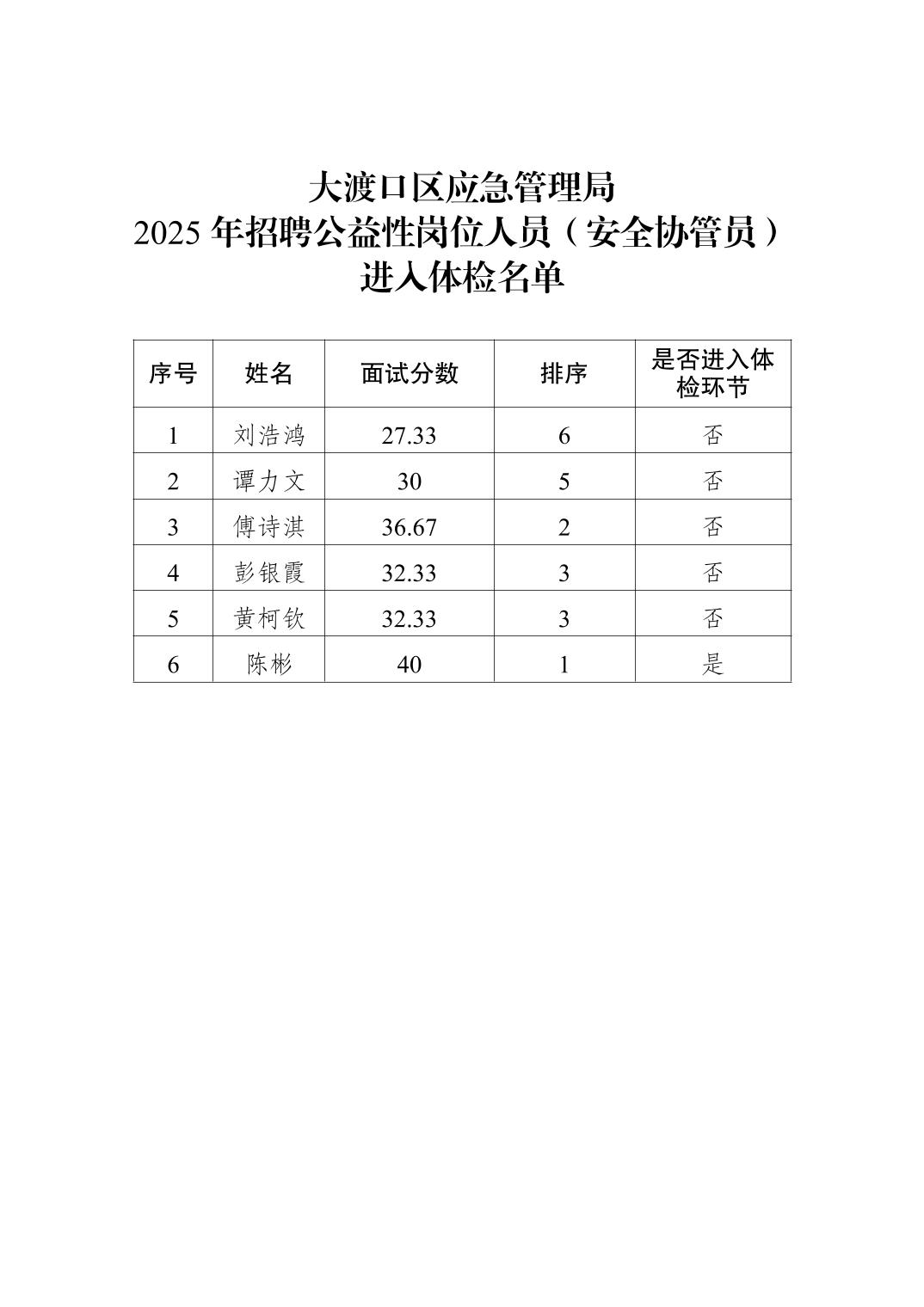 大渡口区应急管理局 2025年招聘公益性岗位人员(安全协管员) 进入体检名单