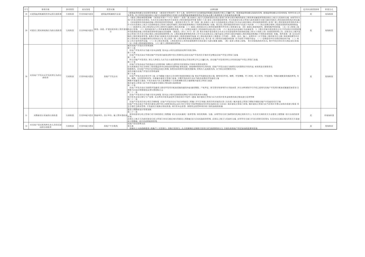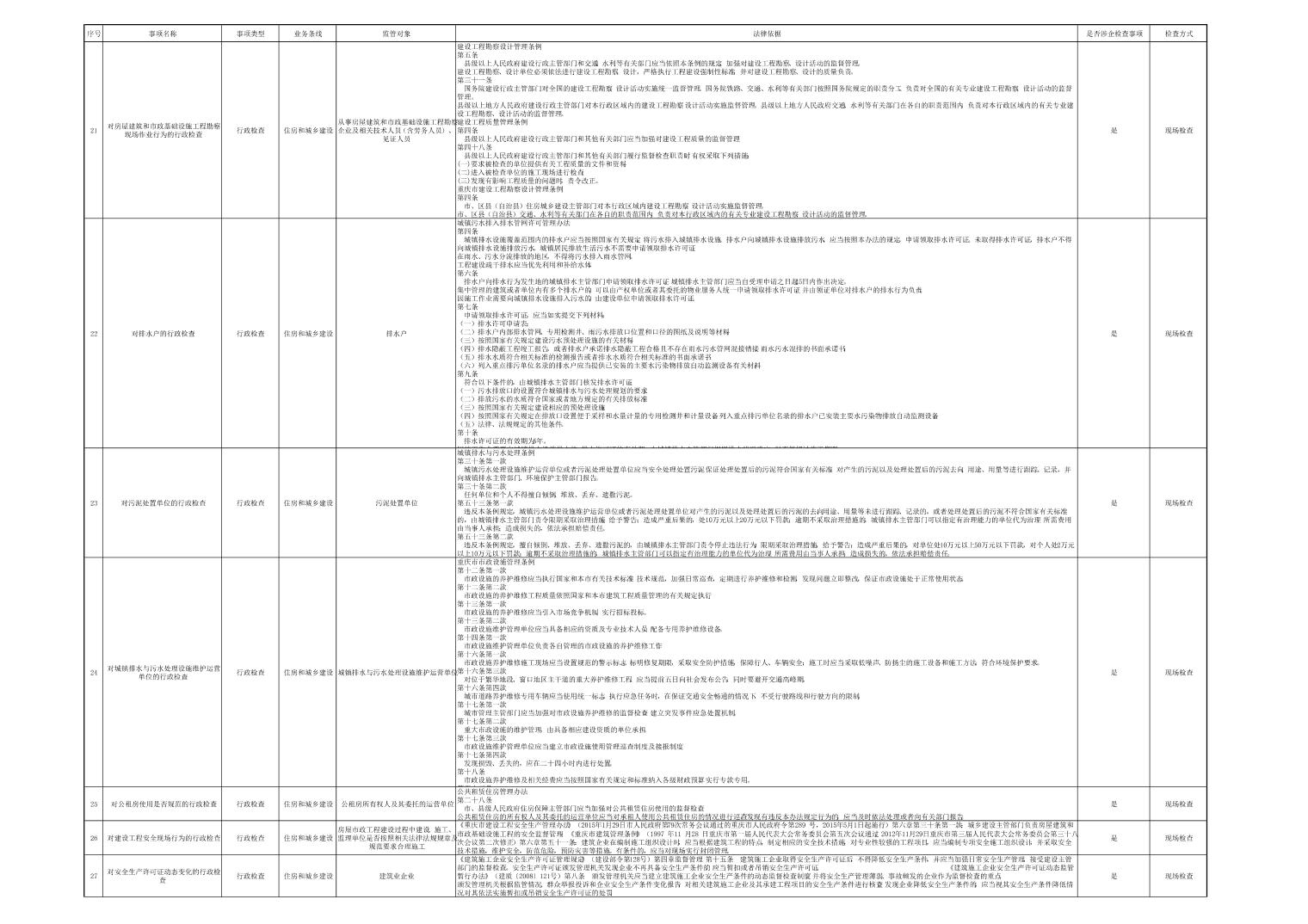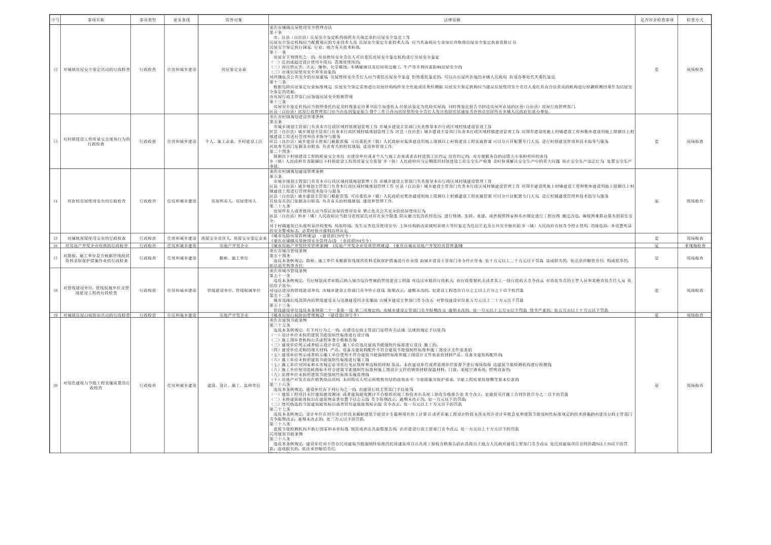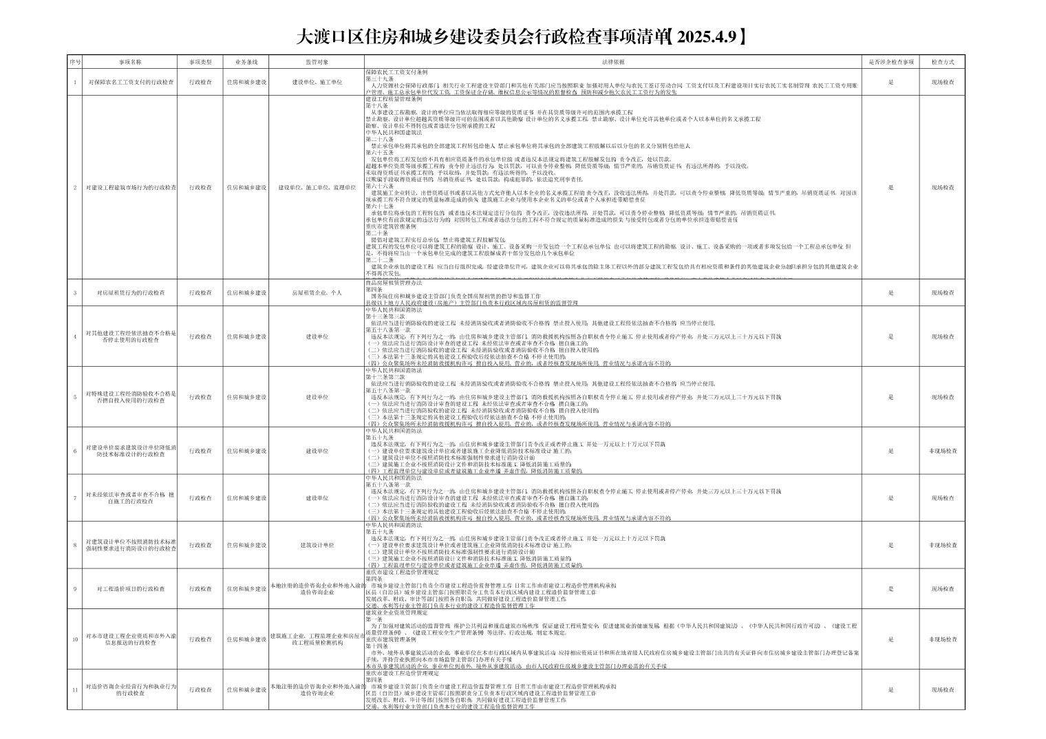 大渡口区住房和城乡建设委员会行政检查事项清单