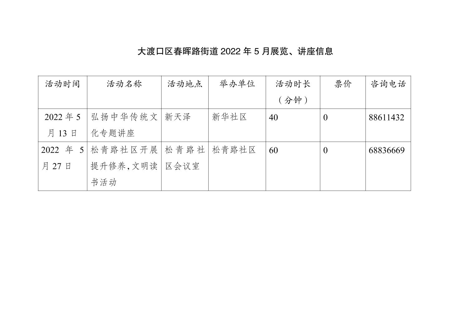 大渡口区春晖路街道2022年5月展览、讲座信息.docx