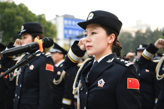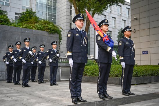 9时,升警旗仪式正式开始。参加仪式的全体民警身穿警礼服,头戴礼仪帽,整齐列队。仪仗队员英姿飒爽、步履铿锵,护卫中国人民警察警旗行进至升旗台。在嘹亮的中国人民警察警歌中,象征着人民警察荣誉、责任和使命的警旗徐徐升起、迎风飘扬。现场民警肃立注目,向警旗敬礼。