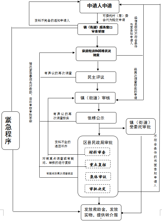 2.紧急程序。经各镇人民政府(街道办事处)认定为情况紧急、需立即采取措施以防止造成无法挽回的损失或无法改变的严重后果的,各镇人民政府(街道办事处)应先行救助。紧急情况解除后应按规定在30个工作日内补齐审核审批手续。