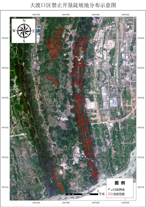 大渡口区禁止开垦陡坡地范围分布在跳磴镇,均在坡度为25°以上的林地内,划定图斑12个,共计3.29平方公里。