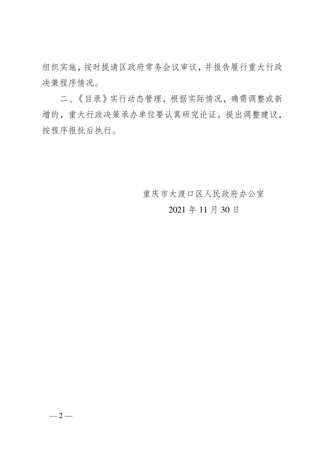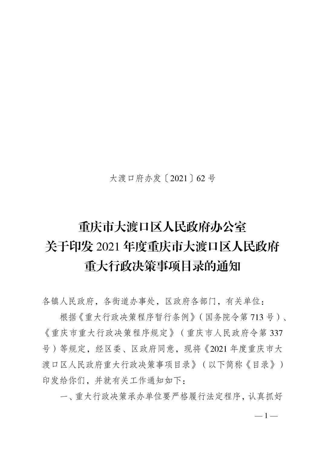 重庆市大渡口区人民政府办公室关于印发2021年度重庆市大渡口区人民政府重大行政决策事项目录的通知.pdf