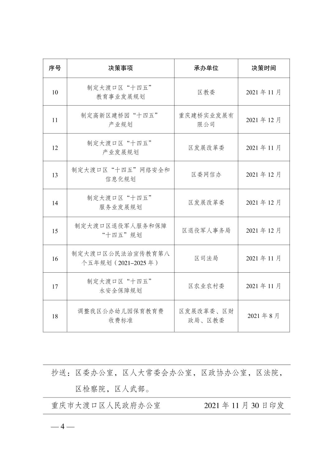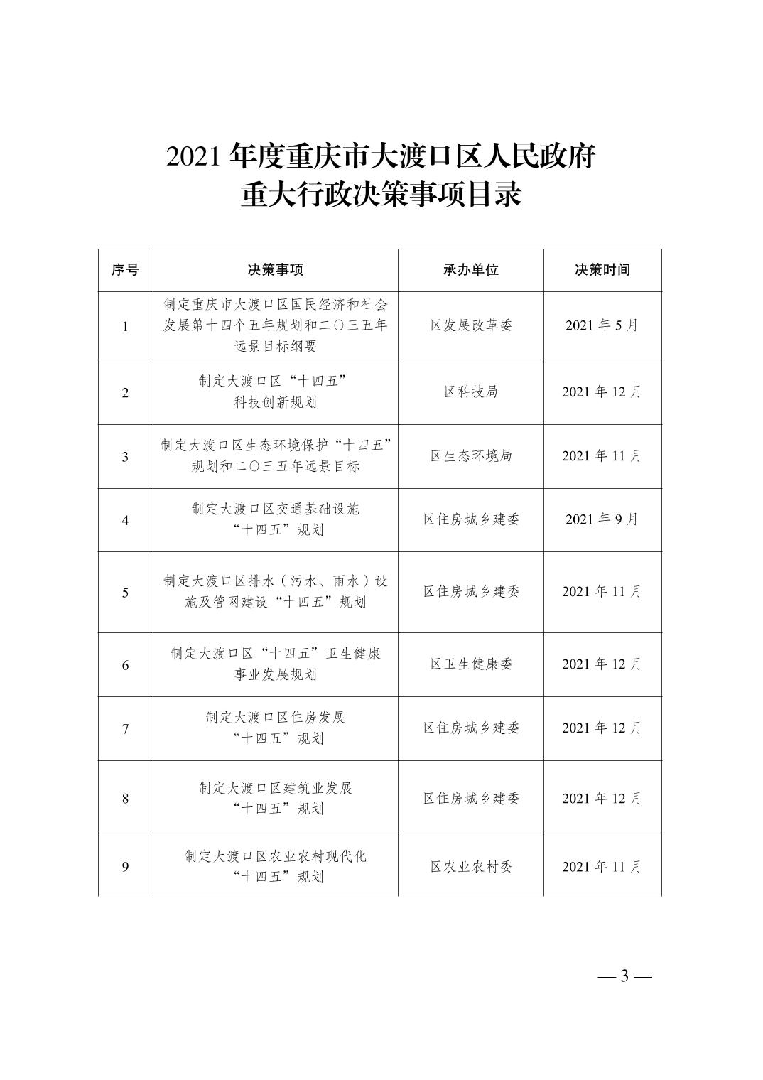 重庆市大渡口区人民政府办公室关于印发2021年度重庆市大渡口区人民政府重大行政决策事项目录的通知