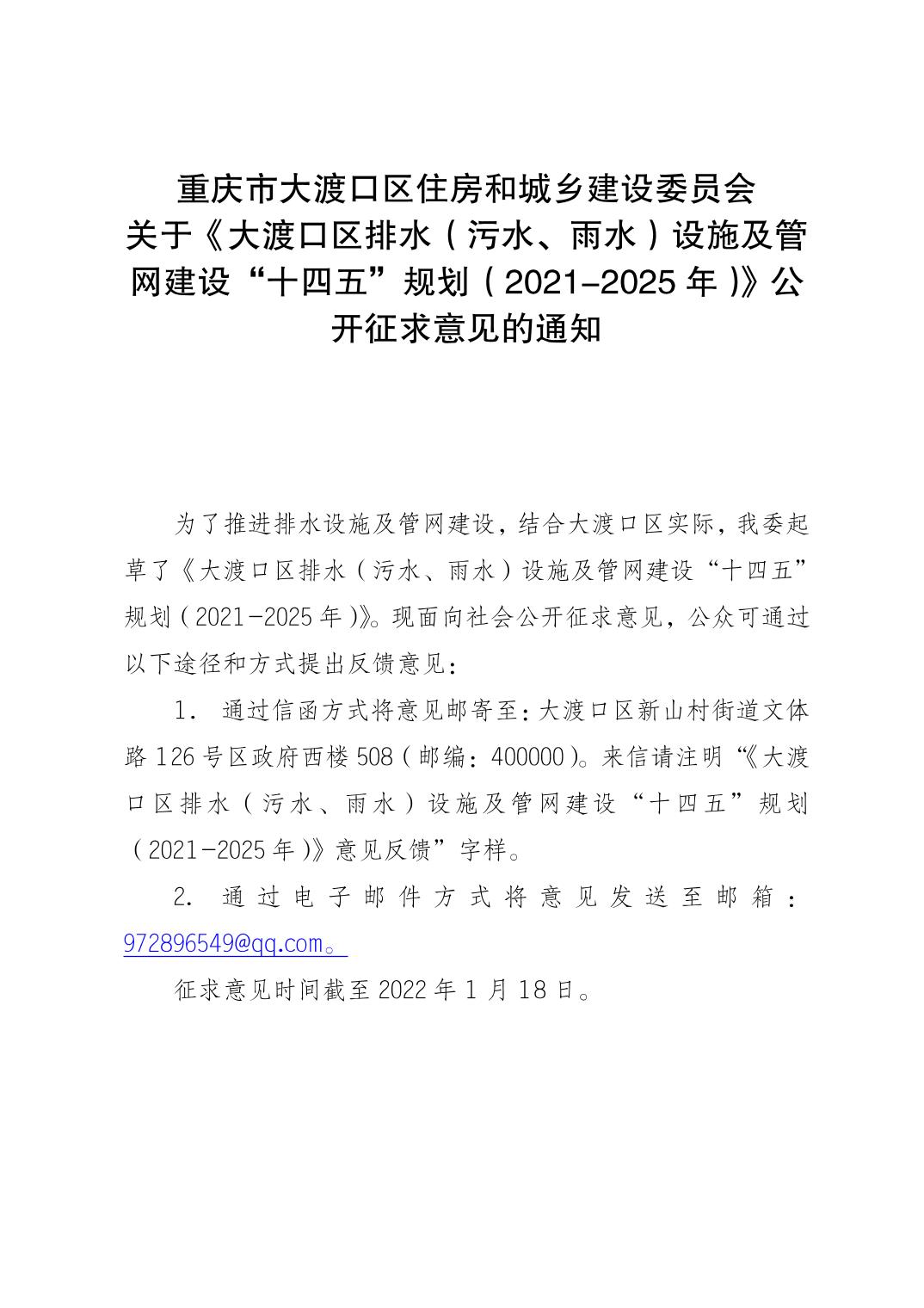 重庆市大渡口区住房和城乡建设委员会 关于《大渡口区排水(污水、雨水)设施及管网建设“十四五”规划(2021-2025年)》公开征求意见的通知