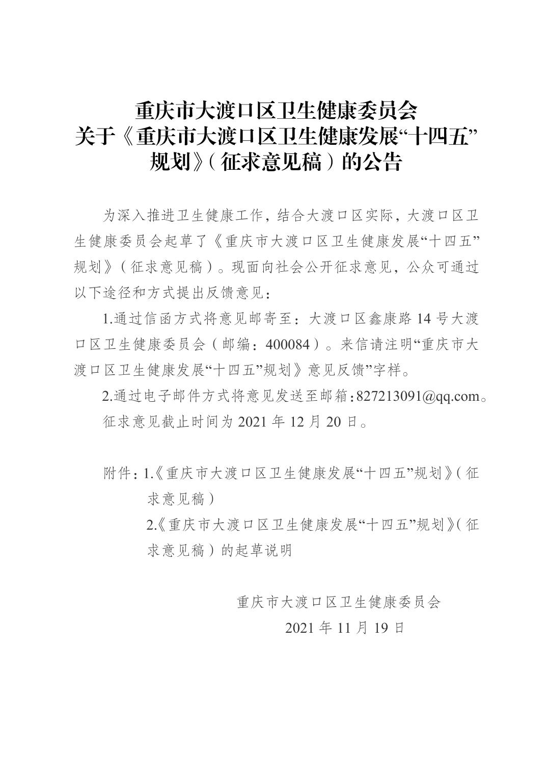 重庆市大渡口区卫生健康委员会关于《重庆市大渡口区卫生健康发展“十四五”规划(征求意见稿)》的公告