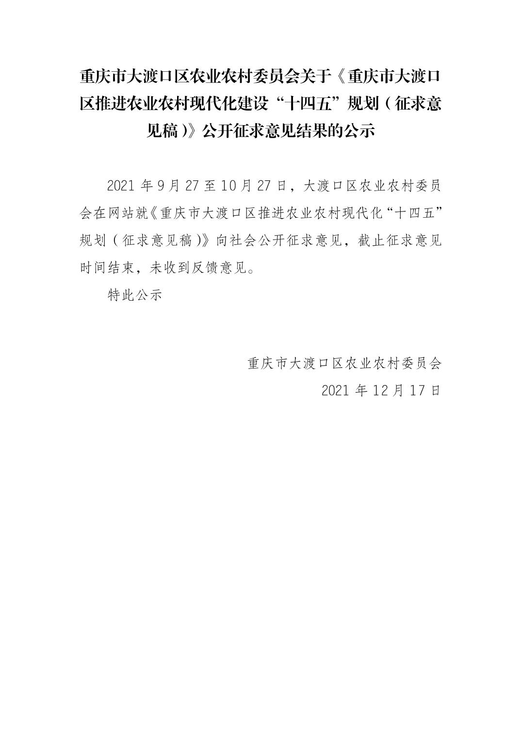 重庆市大渡口区农业农村委员会关于《重庆市大渡口区推进农业农村现代化建设“十四五”规划(征求意见稿)》公开征求意见结果的公示