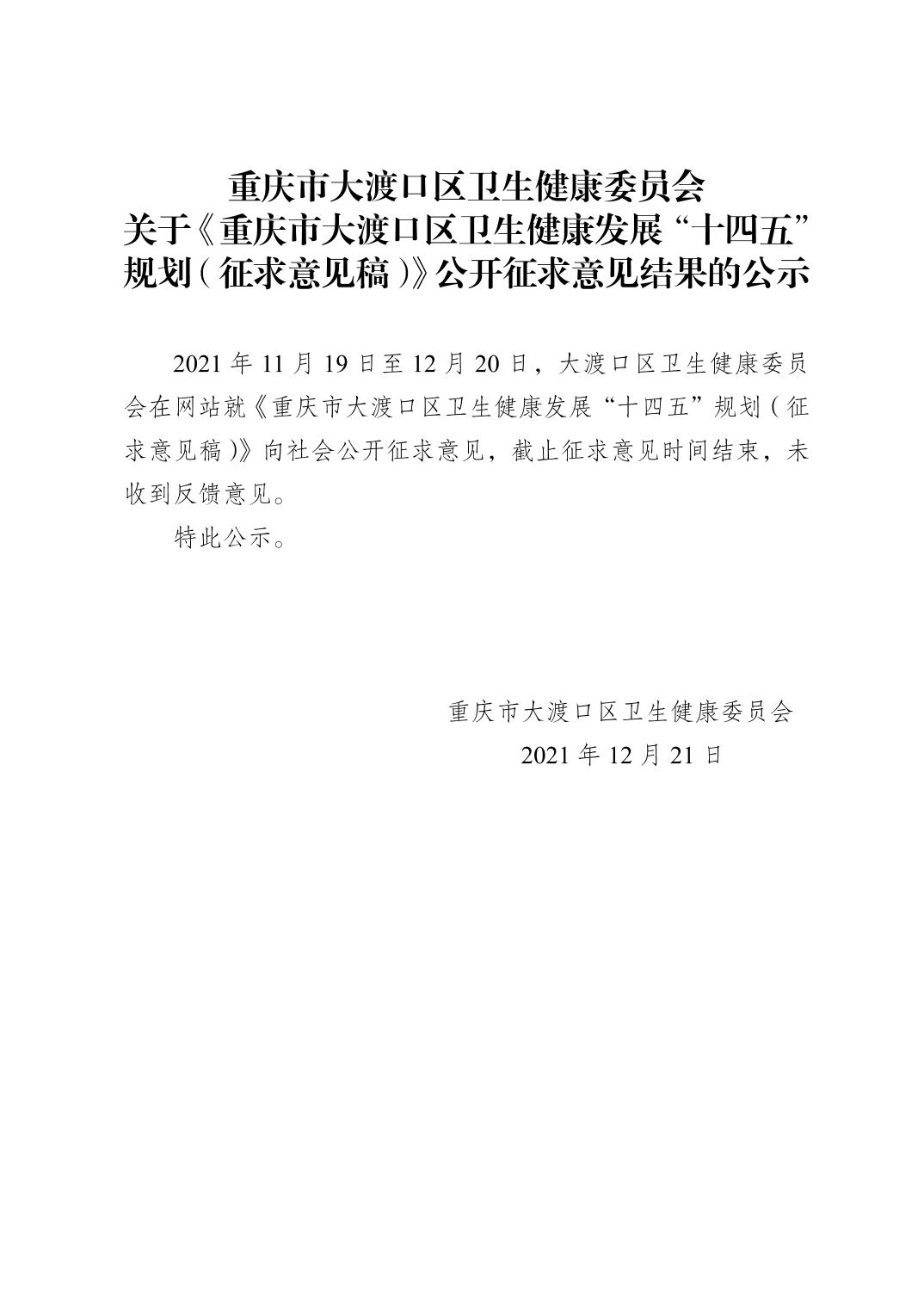 重庆市大渡口区卫生健康委员会 关于《重庆市大渡口区卫生健康发展“十四五”规划(征求意见稿)》公开征求意见结果的公示