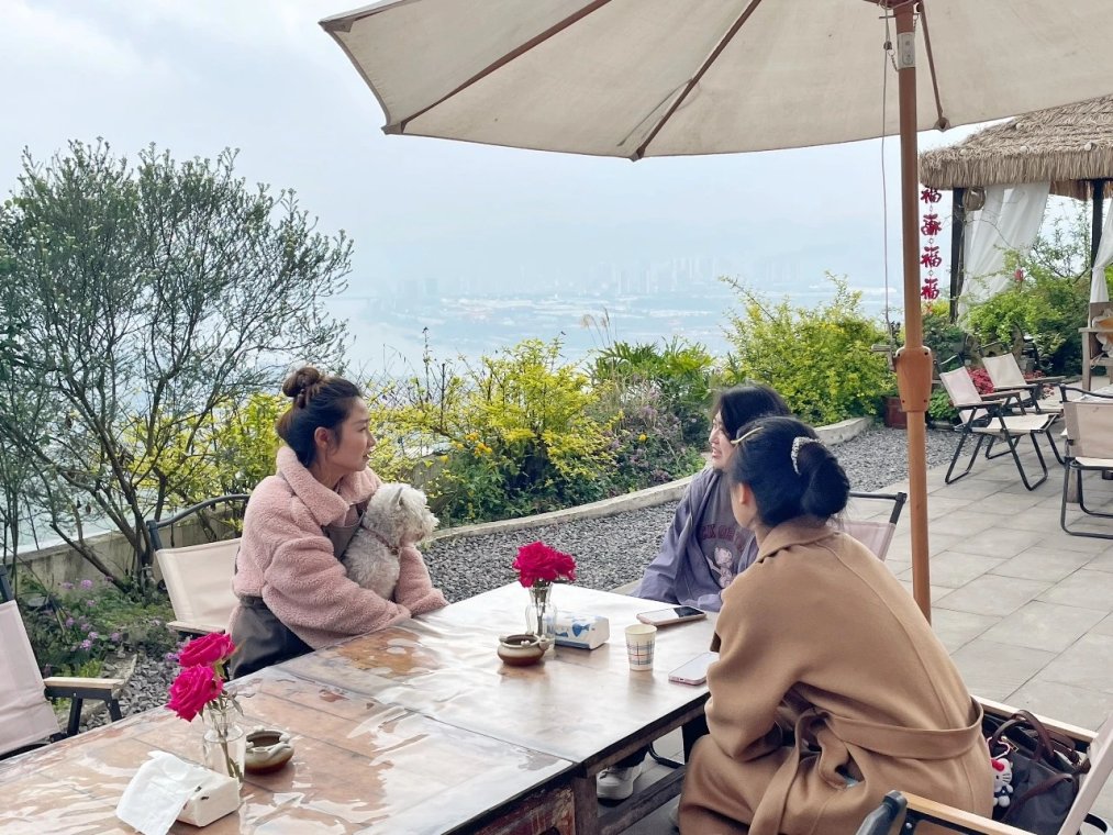 3月25日,大渡口区金鳌山上,江风习习,满山的鲁冰花、牵牛花等争相开放,不少人漫步其中,拍照打卡。俯视山下,一座座民宿点缀在半山腰上,游客喝茶、聊天,怡然自得。