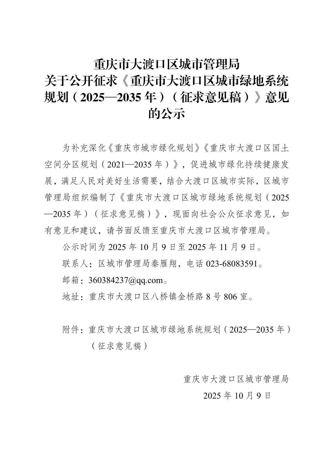 重庆市大渡口区城市管理局关于公开征求《重庆市大渡口区城市绿地系统规划(2025—2035)(征求意见稿)》意见的公示