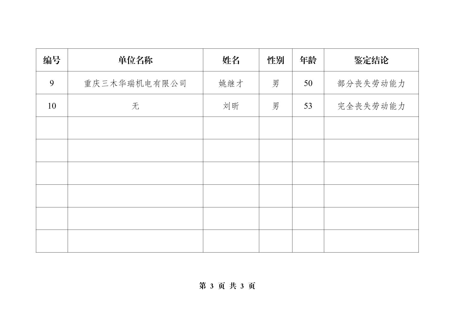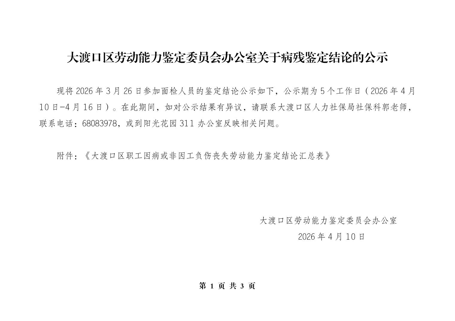 大渡口区劳动能力鉴定委员会办公室关于病残鉴定结论的公示202602批次