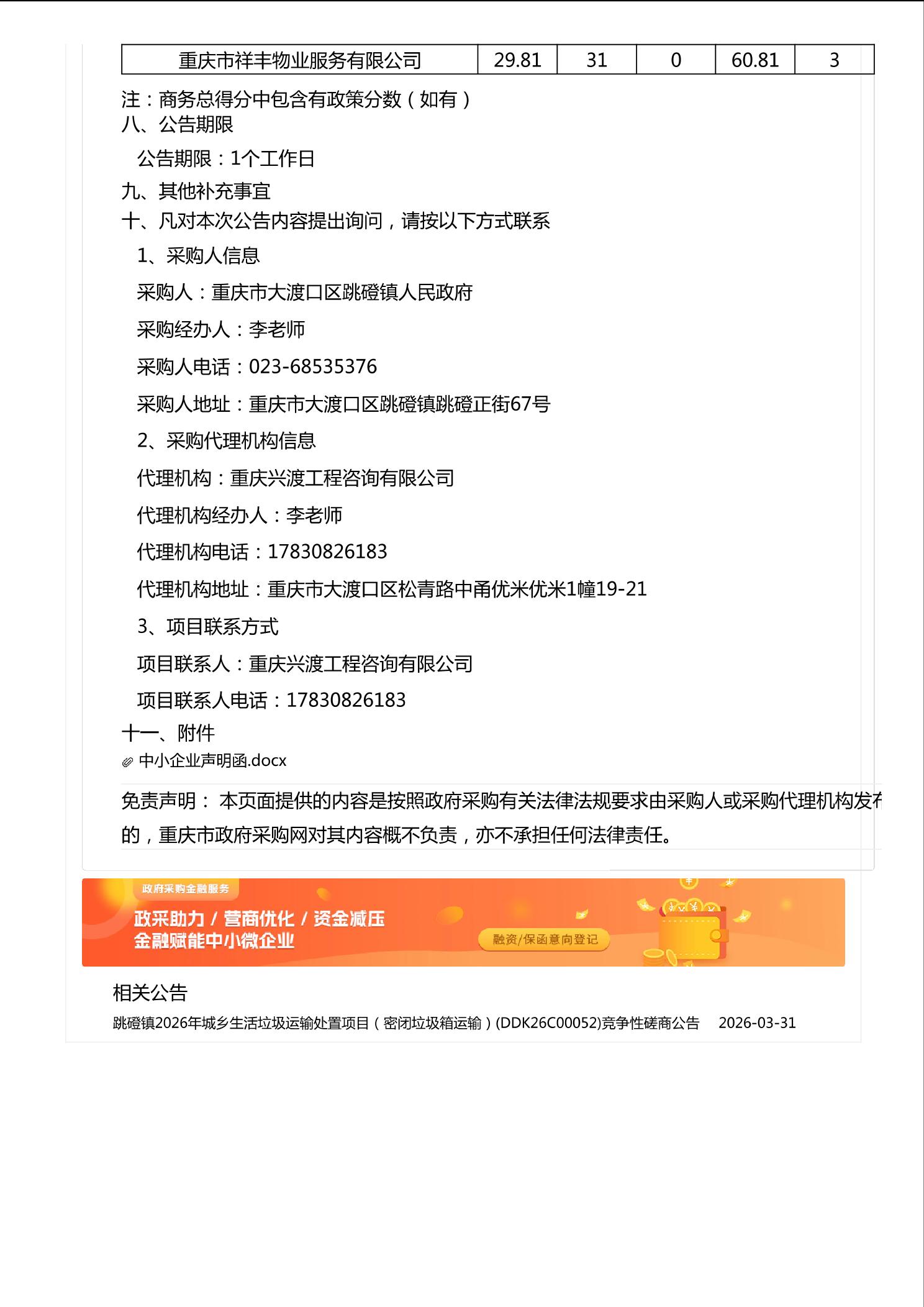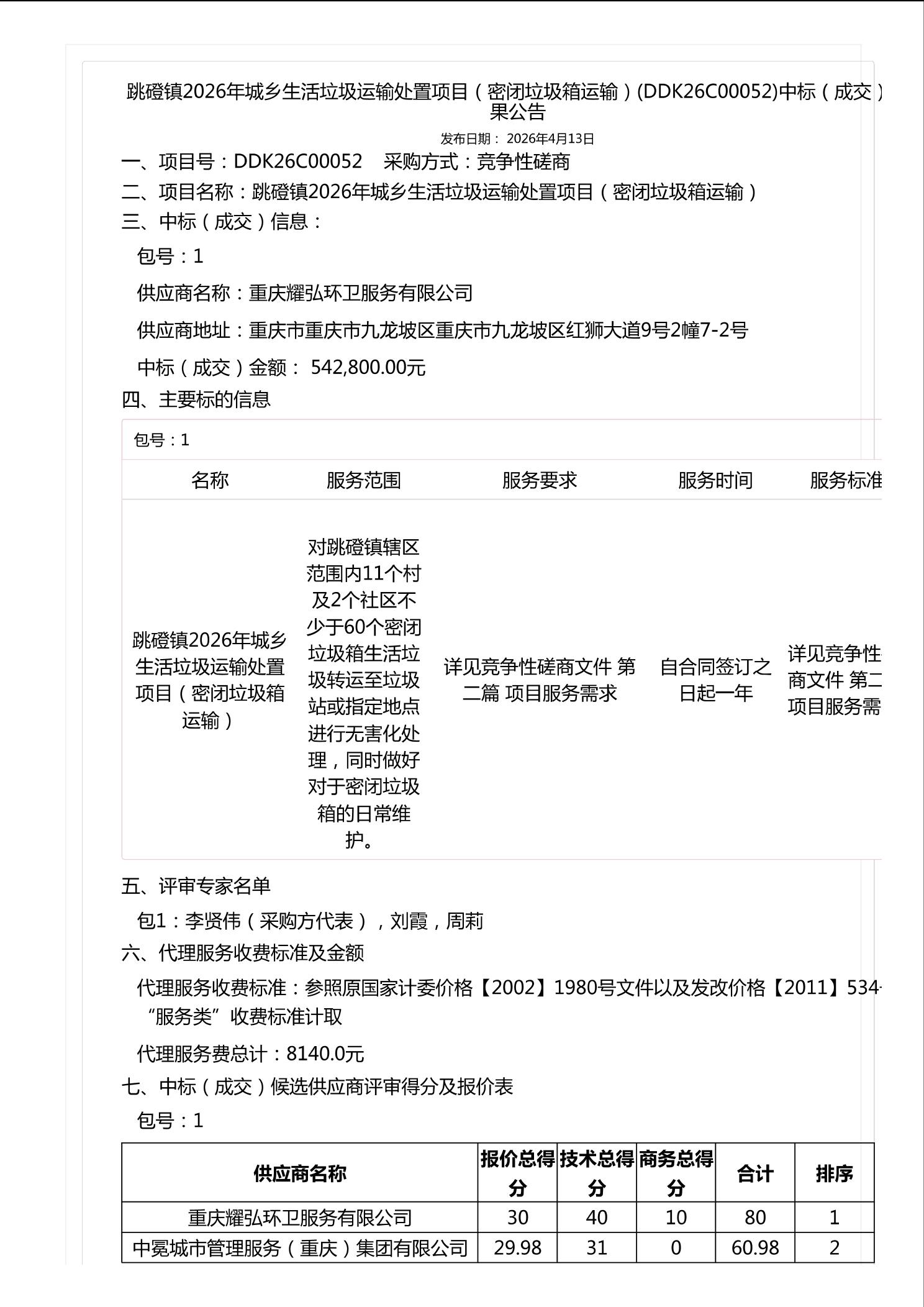 跳磴镇2026年城乡生活垃圾运输处置项目(密闭垃圾箱运输)(DDK26C00052)中标(成交)结果公告