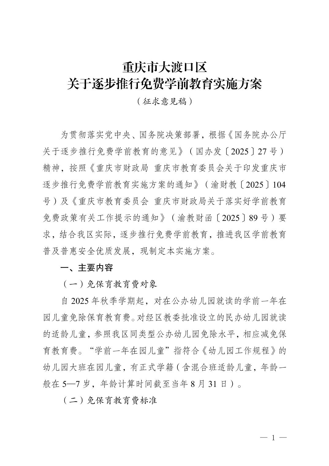 大渡口区逐步推行免费学前教育实施方案(征求意见稿)