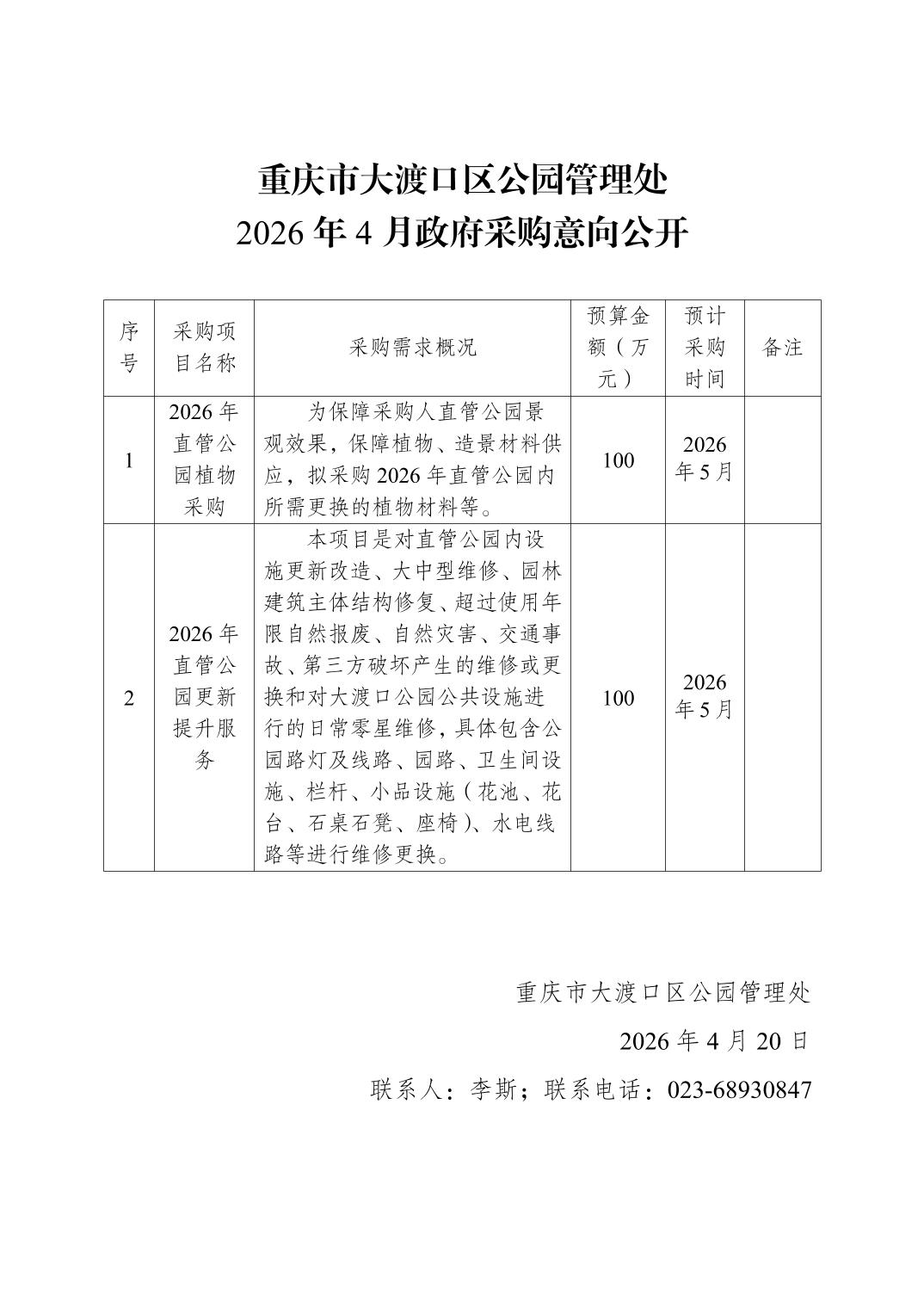 重庆市大渡口区公园管理处2026年4月政府采购意向公开