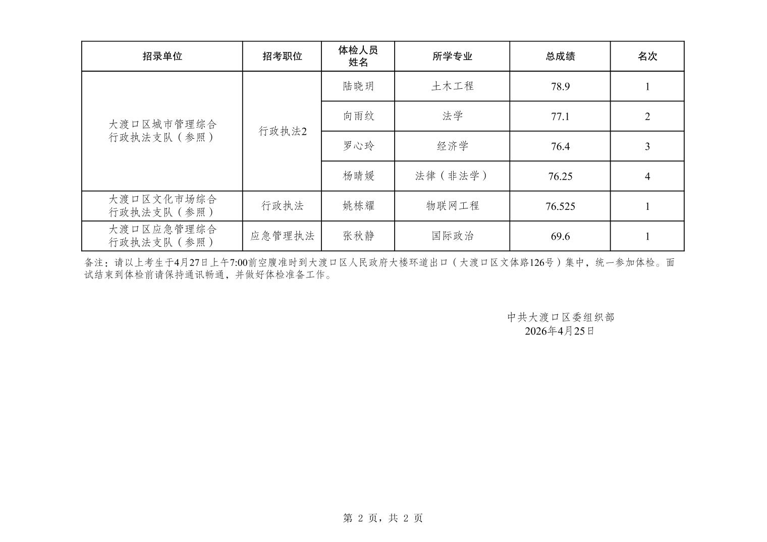 大渡口区2026年度考试录用公务员参加体检人员公布表