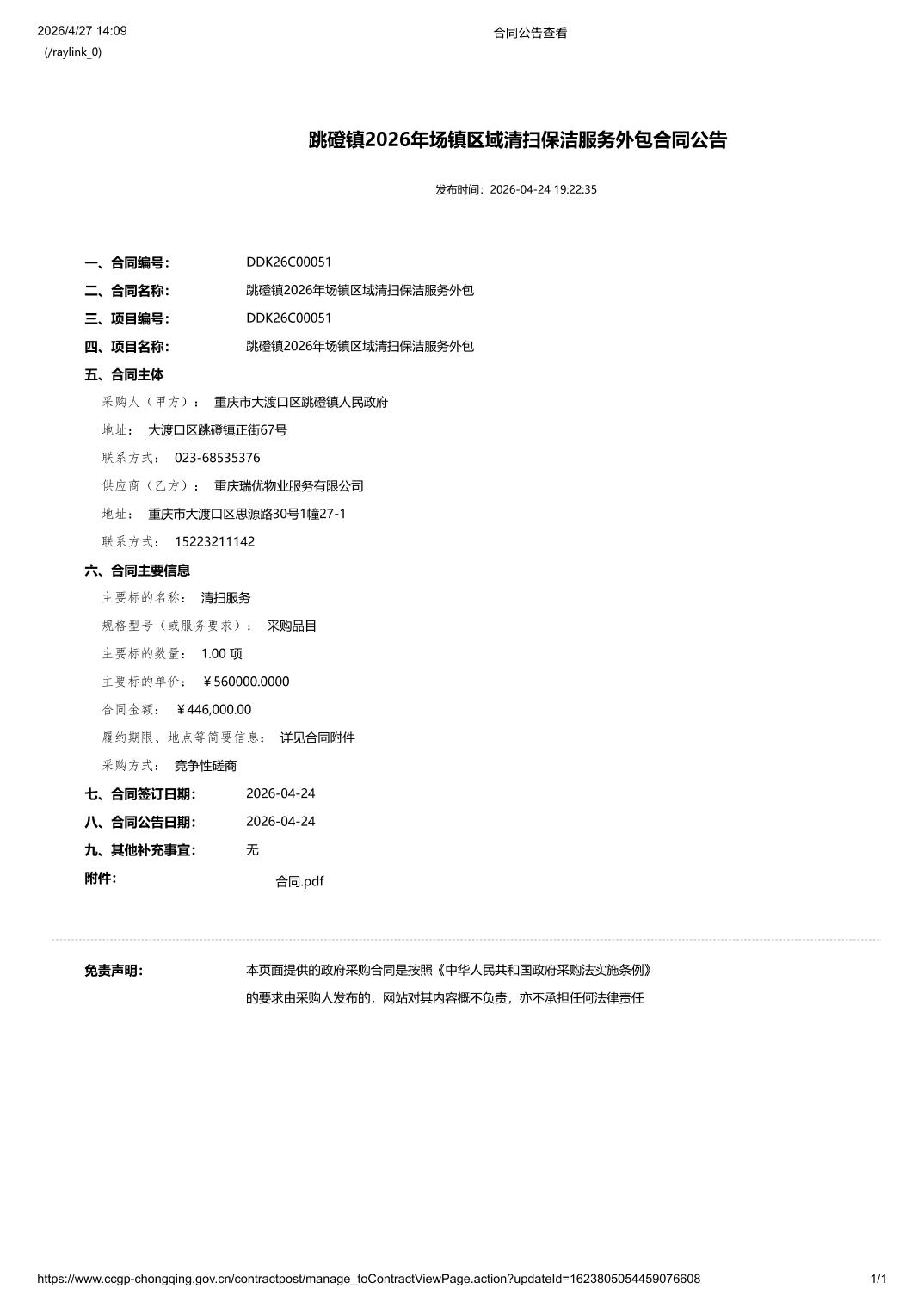 跳磴镇2026年场镇区域清扫保洁服务外包合同公告
