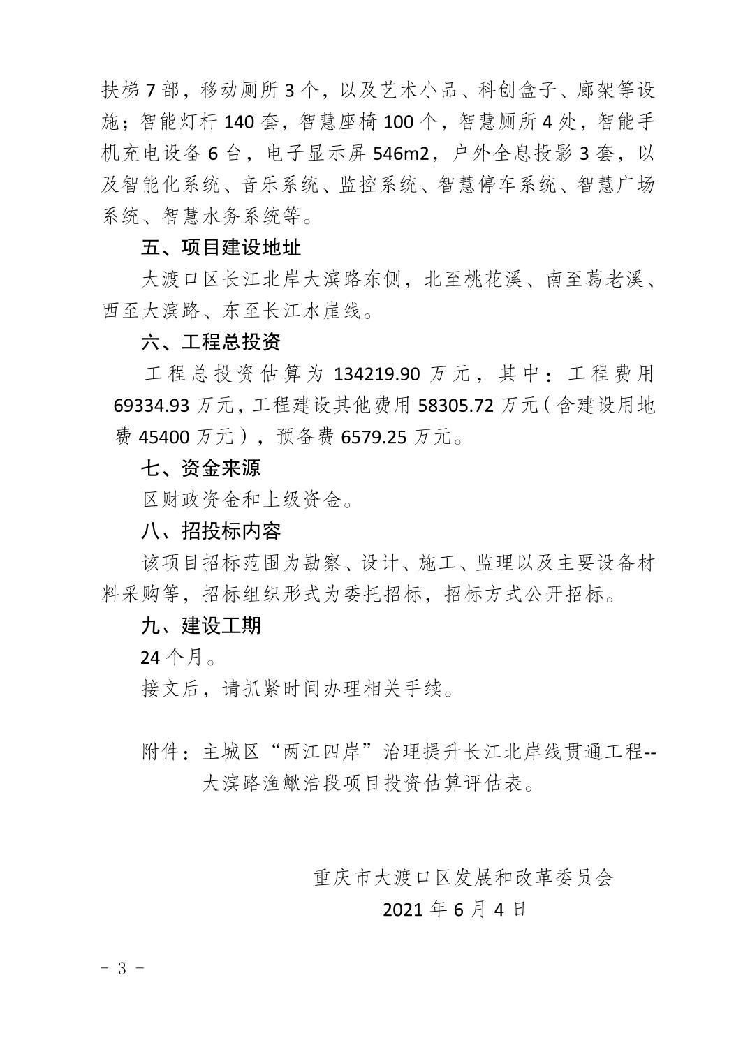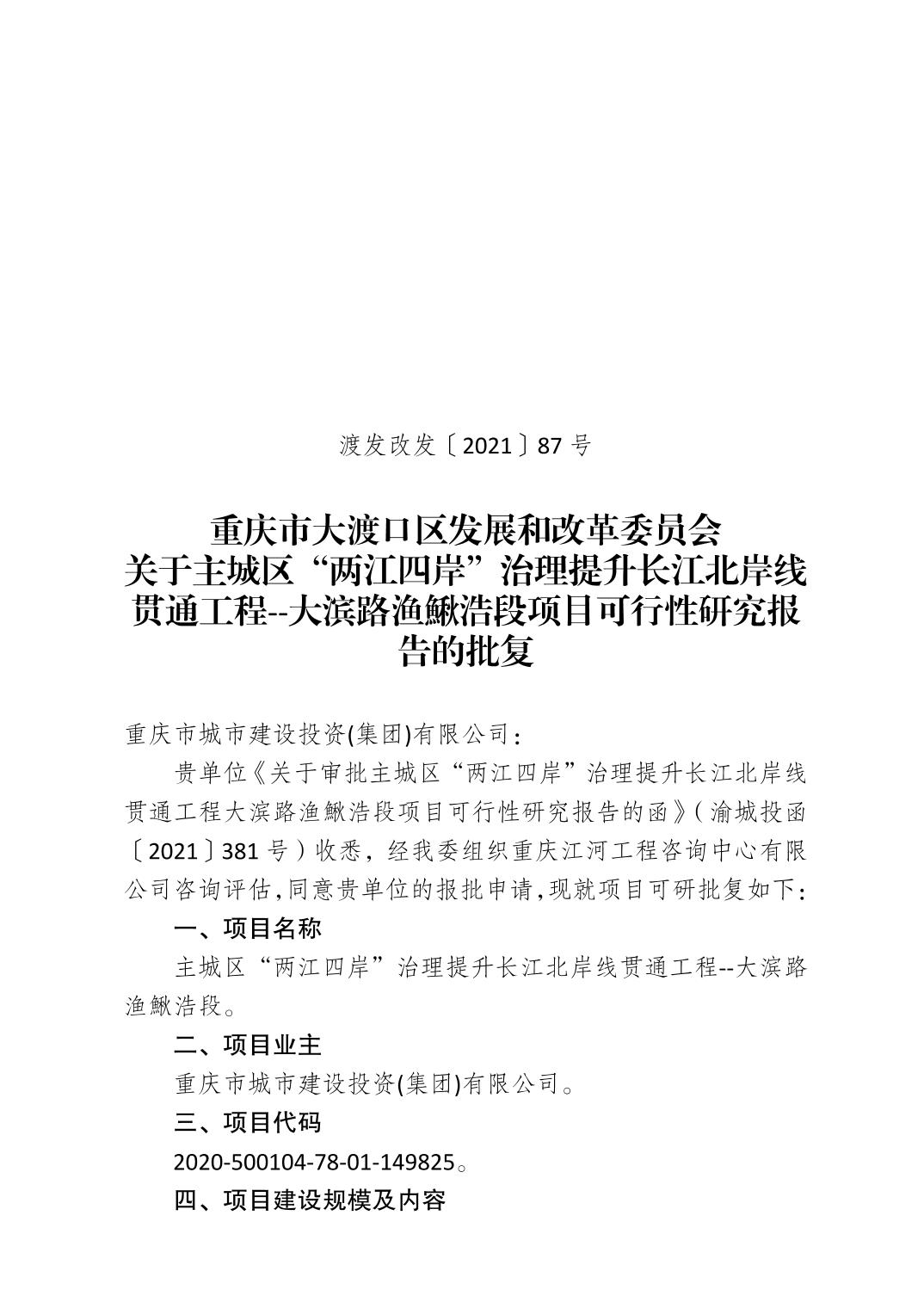 重庆市大渡口区发展和改革委员会关于主城区“两江四岸”治理提升长江北岸线贯通工程--大滨路渔鰍浩段项目可行性研究报告的批复.pdf