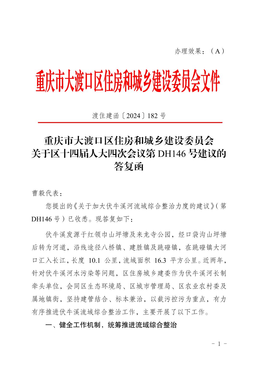 重庆市大渡口区住房和城乡建设委员会关于区十四届人大四次会议第DH146号建议的答复函