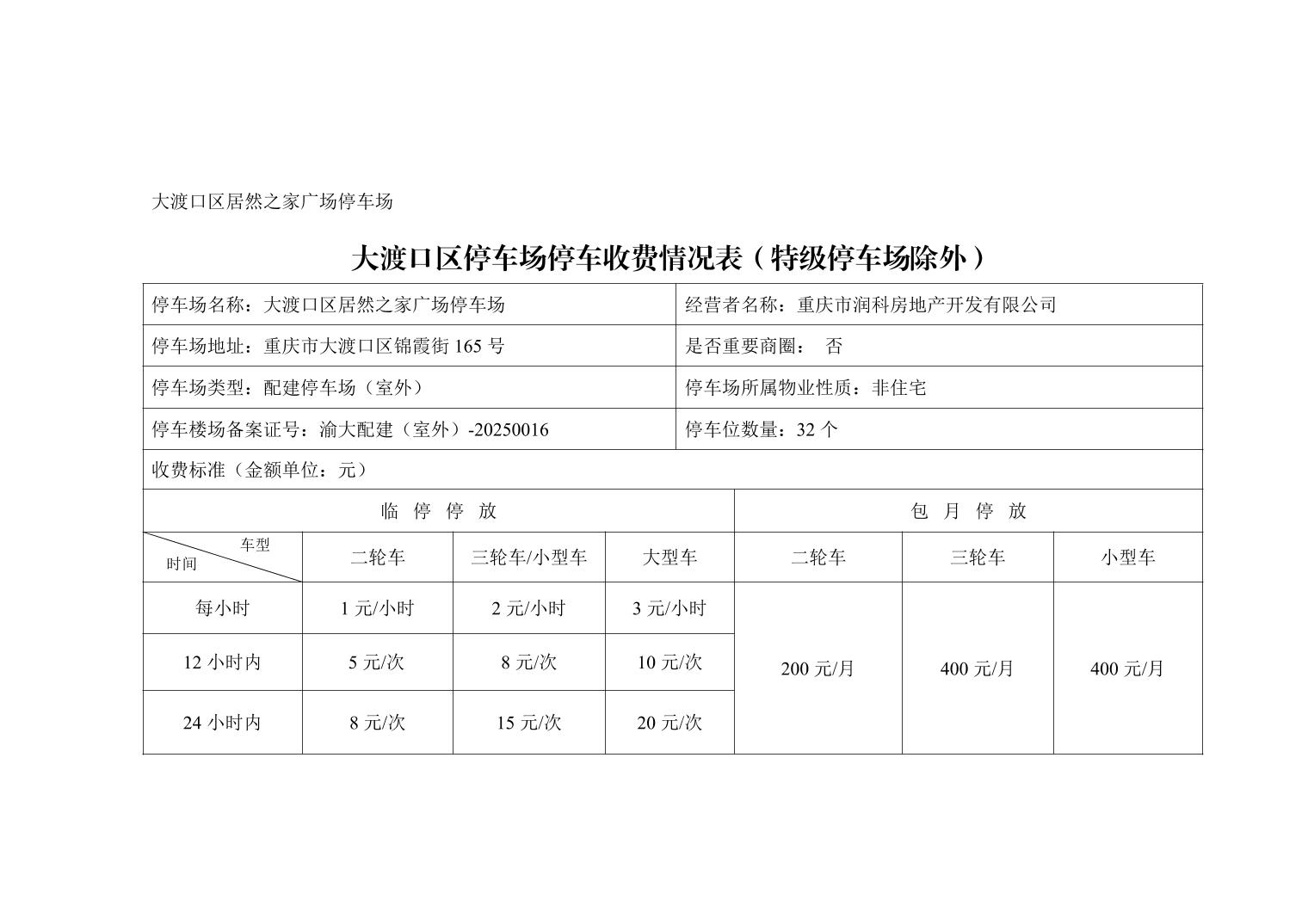 大渡口区停车场停车收费情况表(特级停车场除外)(2026.1.14大渡口区居然之家广场停车场)