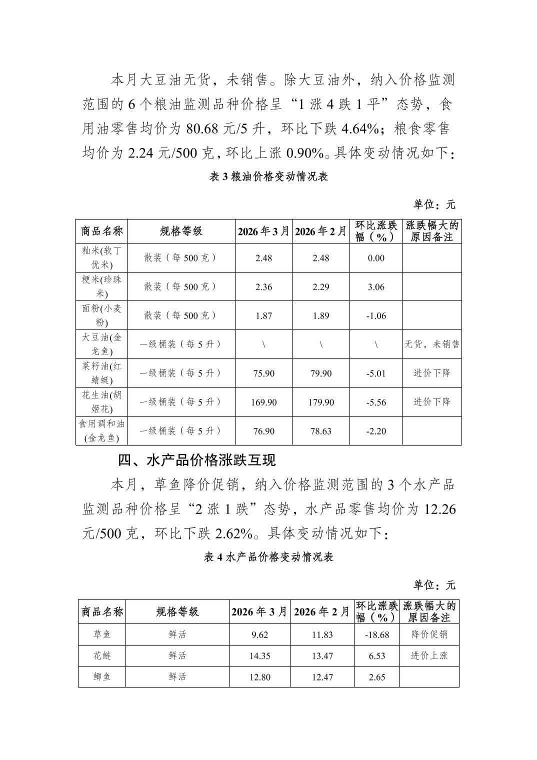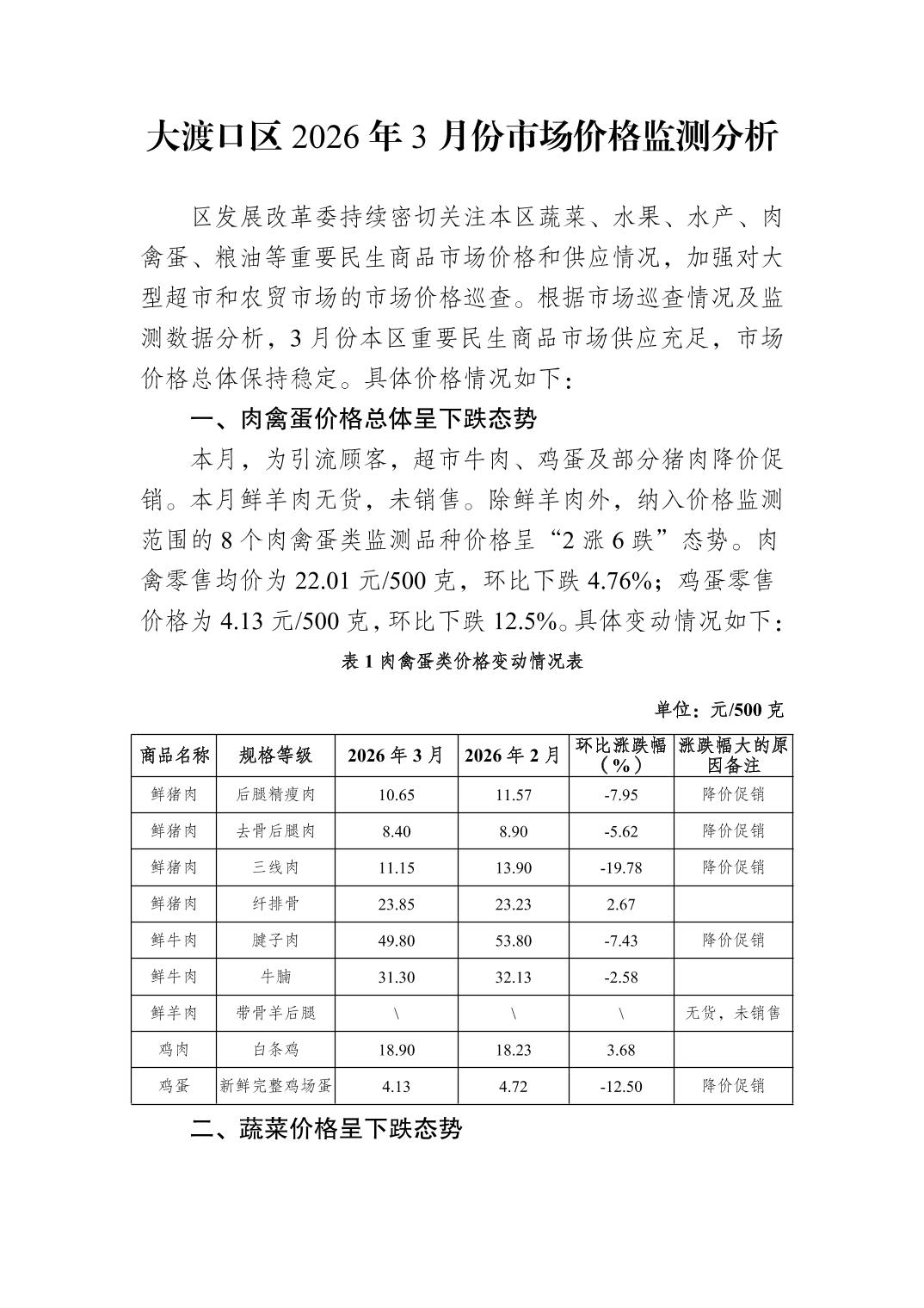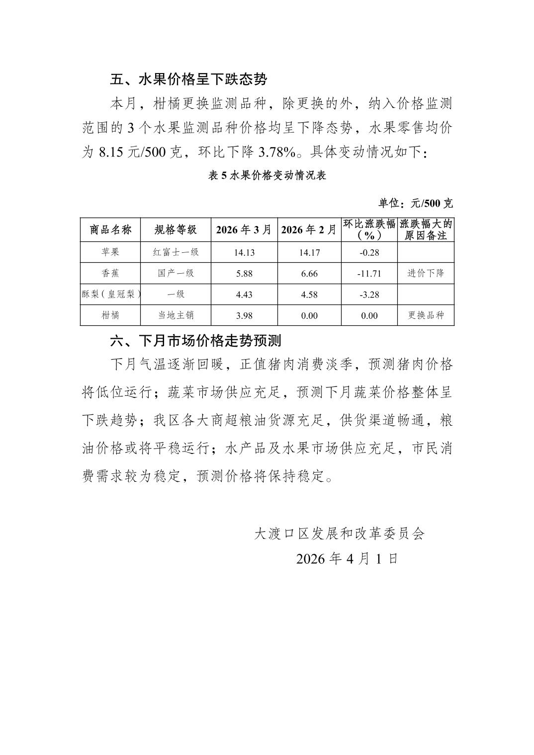 大渡口区2026年3月份市场价格监测分析