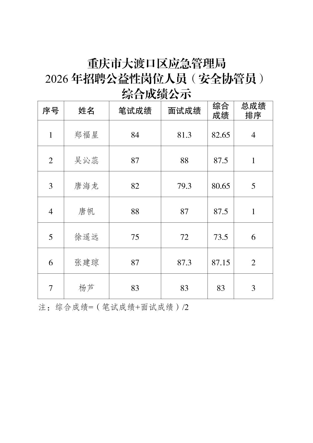 重庆市大渡口区应急管理局2026年招聘公益性岗位综合成绩公示