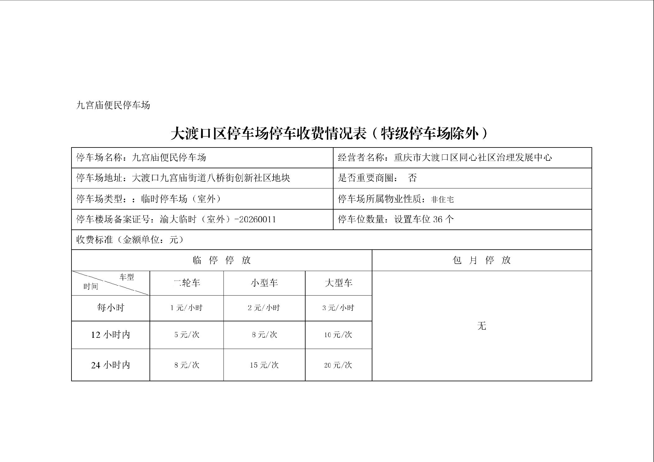 大渡口区停车场停车收费情况表(特级停车场除外)九宫庙便民停车场