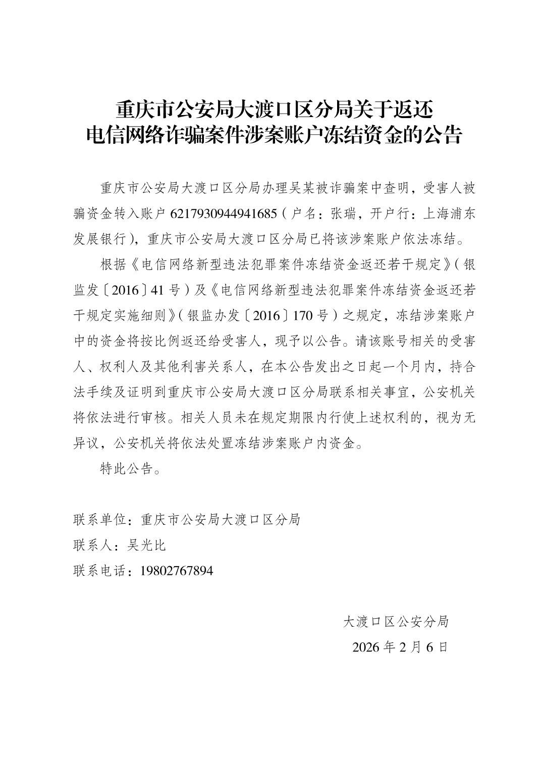 重庆市公安局大渡口区分局关于返还电信网络诈骗案件涉案账户冻结资金的公告