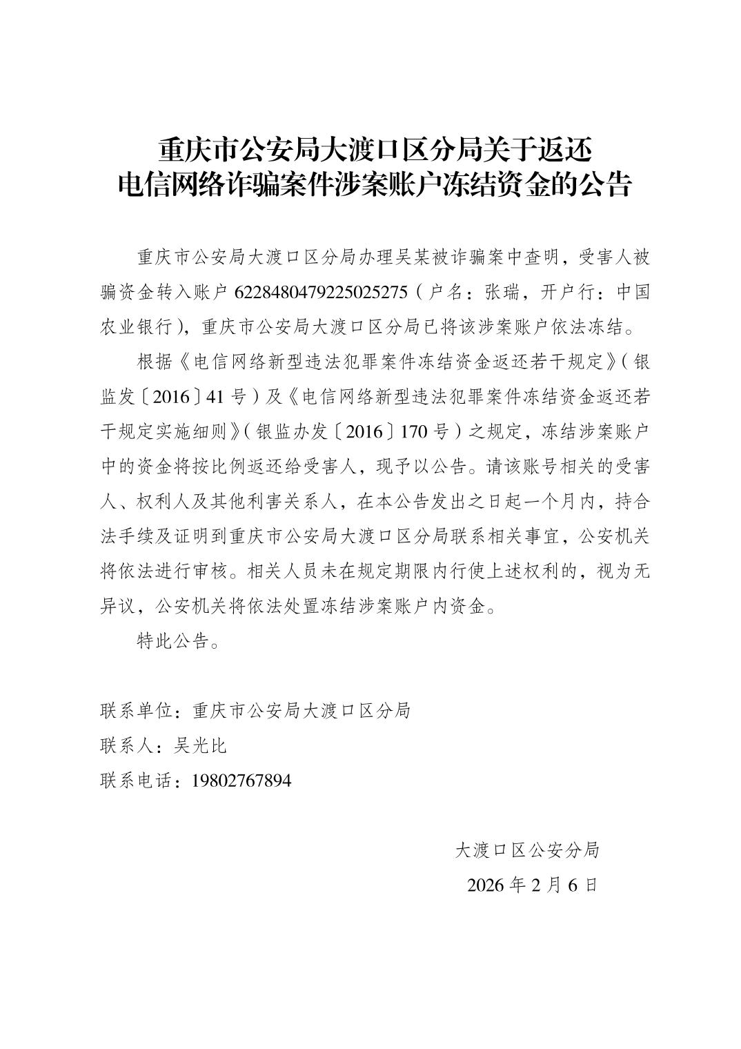 重庆市公安局大渡口区分局关于返还电信网络诈骗案件涉案账户冻结资金的公告