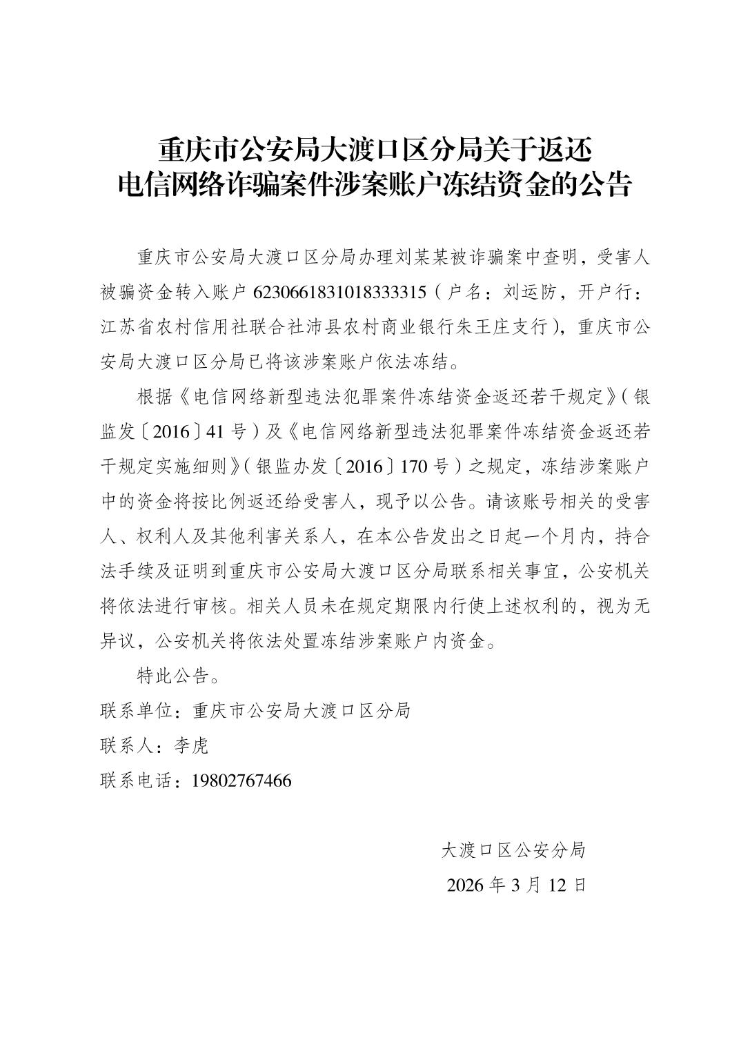 重庆市公安局大渡口区分局关于返还电信网络诈骗案件涉案账户冻结资金的公告
