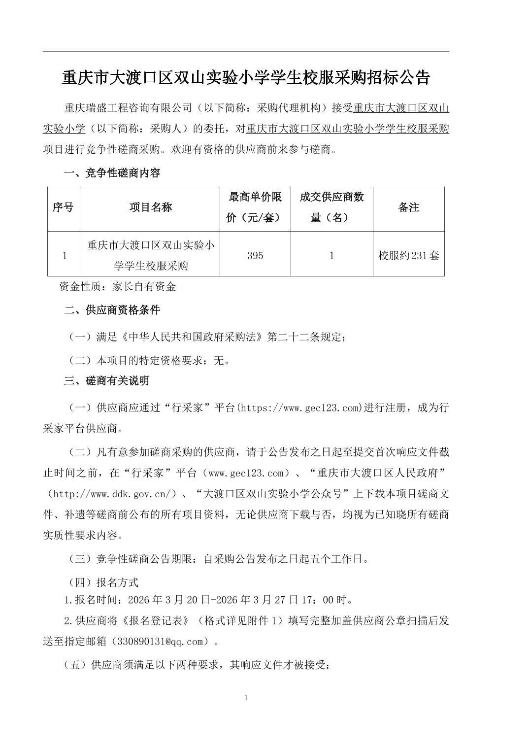重庆市大渡口区双山实验小学学生校服采购招标公告