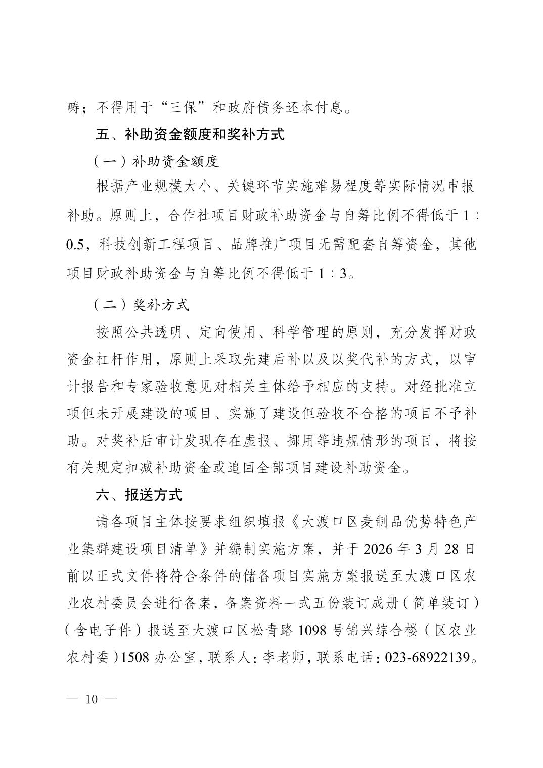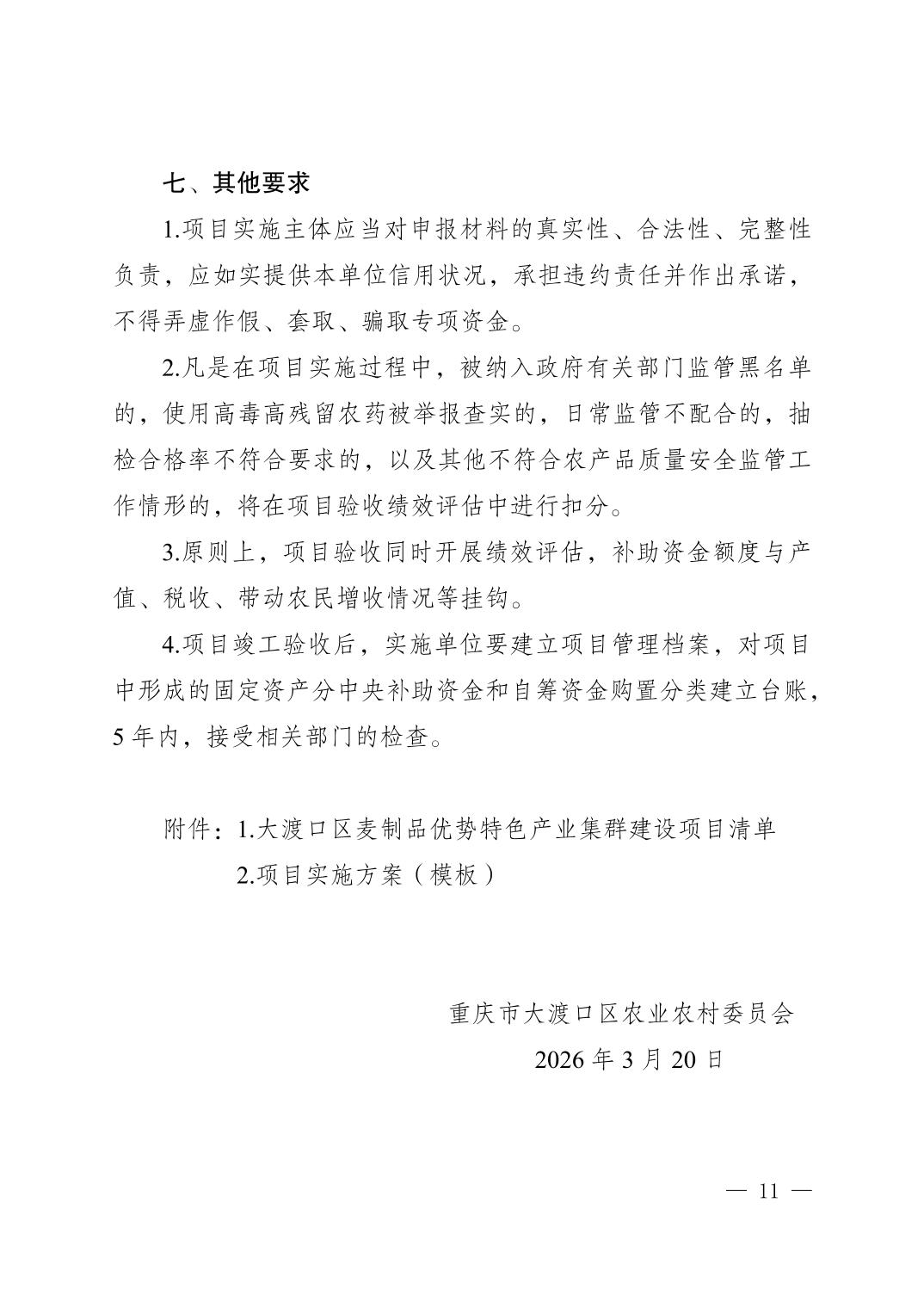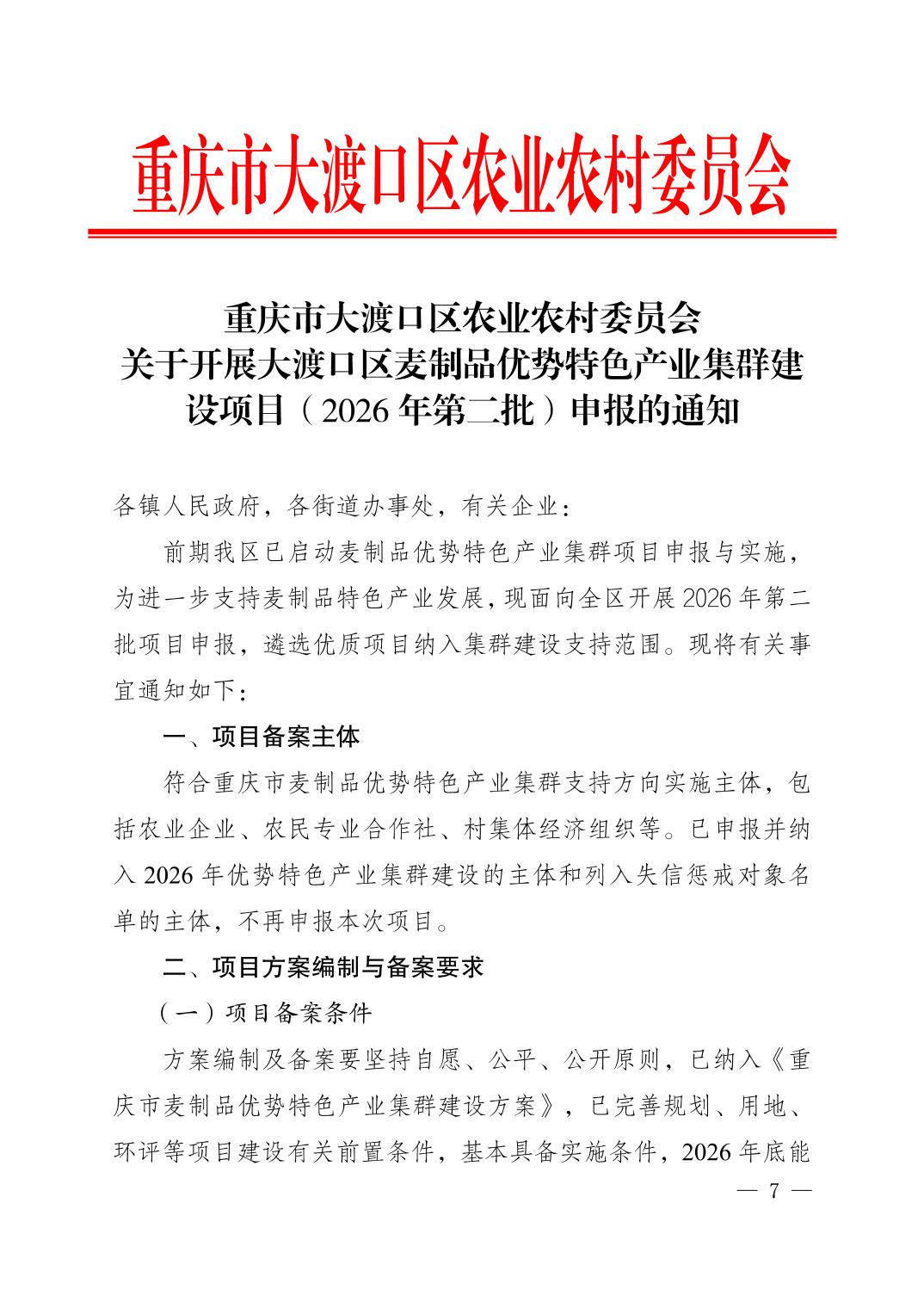 重庆市大渡口区农业农村委员会关于开展大渡口区麦制品优势特色产业集群建设项目(2026年第二批)申报的通知