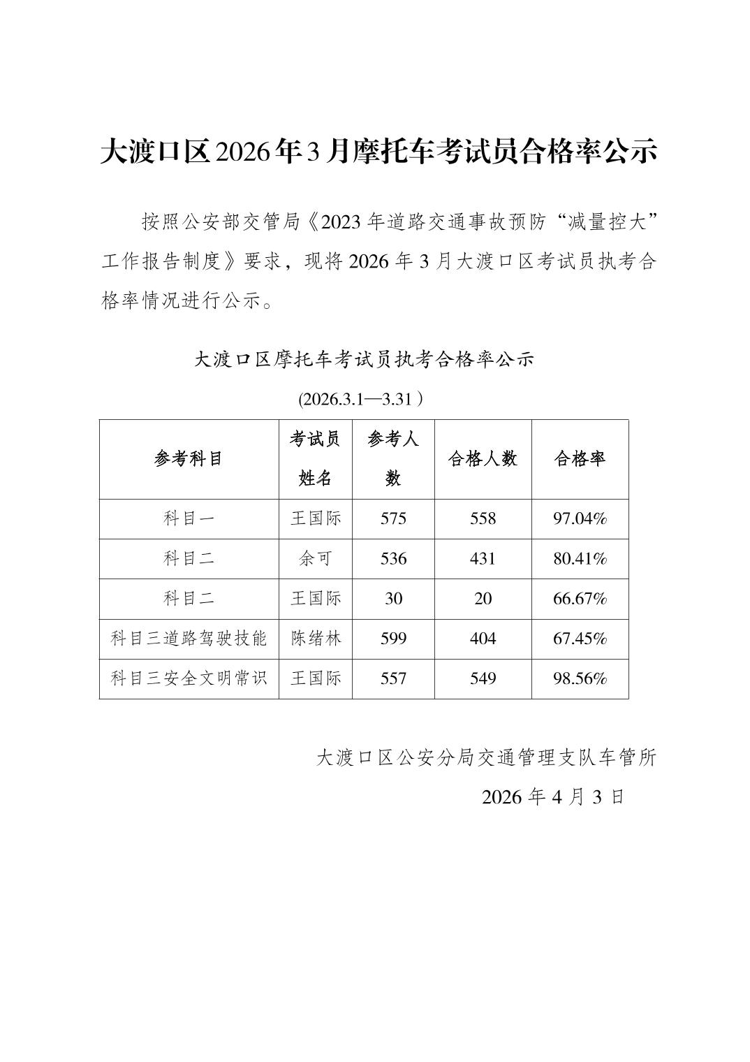 大渡口区2026年3月摩托车考试员合格率公示
