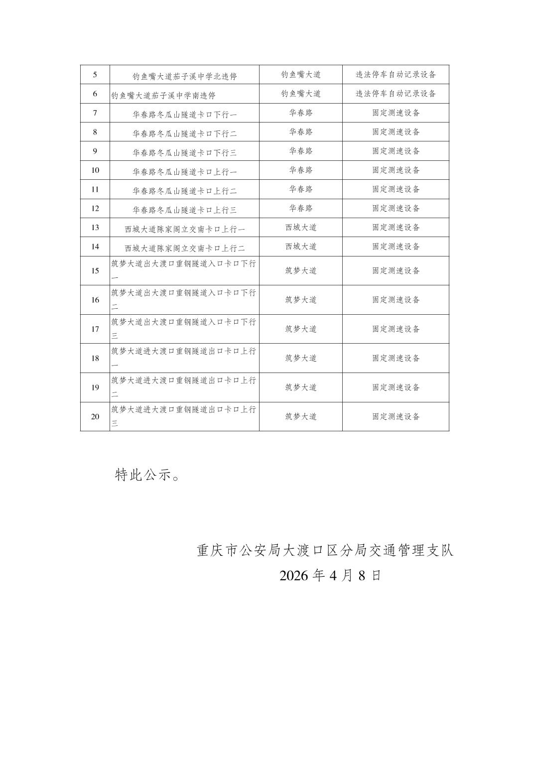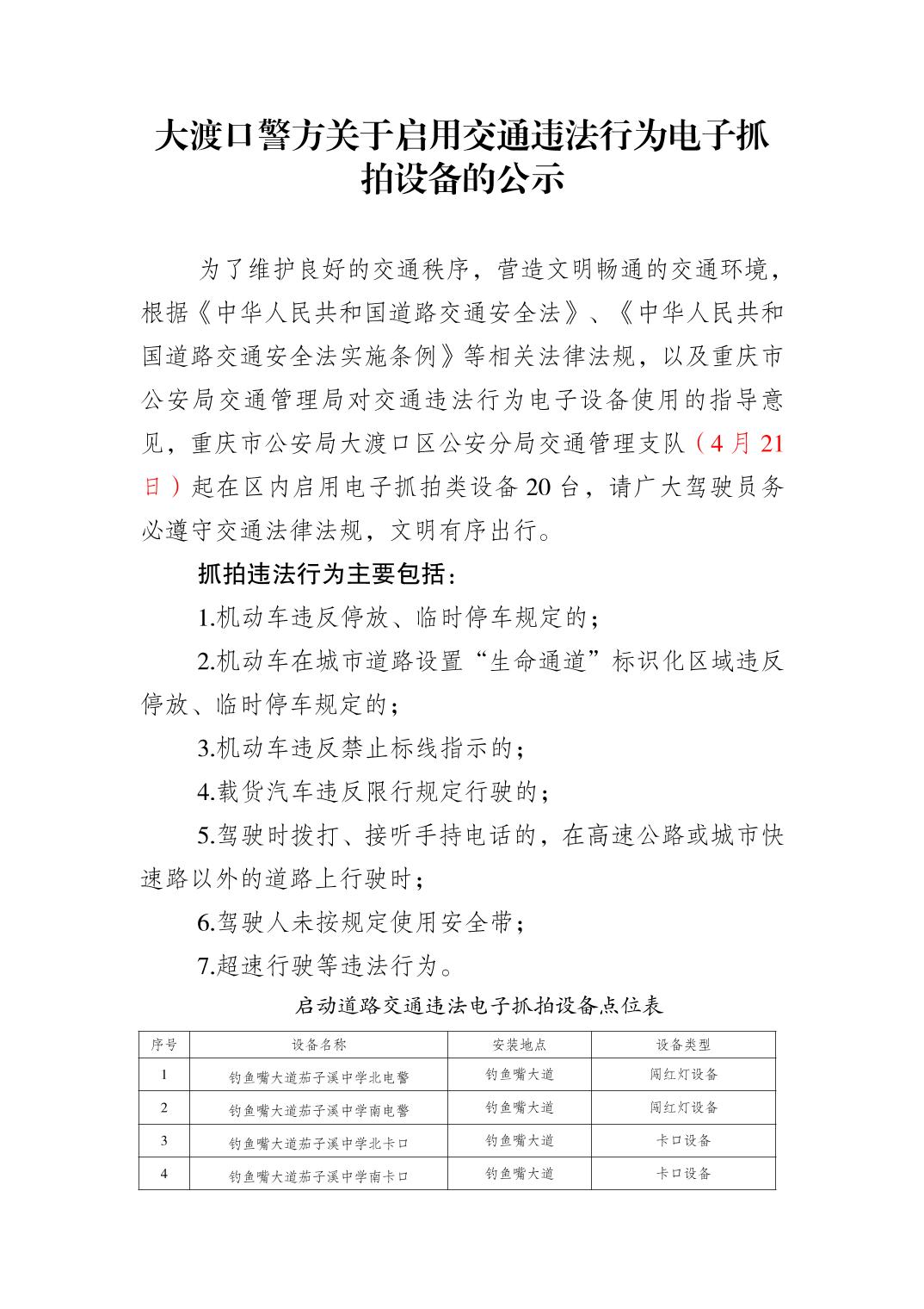 大渡口警方关于启用交通违法行为电子抓拍设备的公示