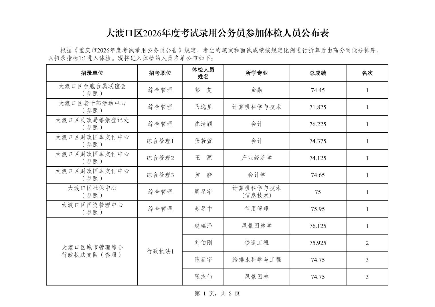 大渡口区2026年度考试录用公务员参加体检人员公布表